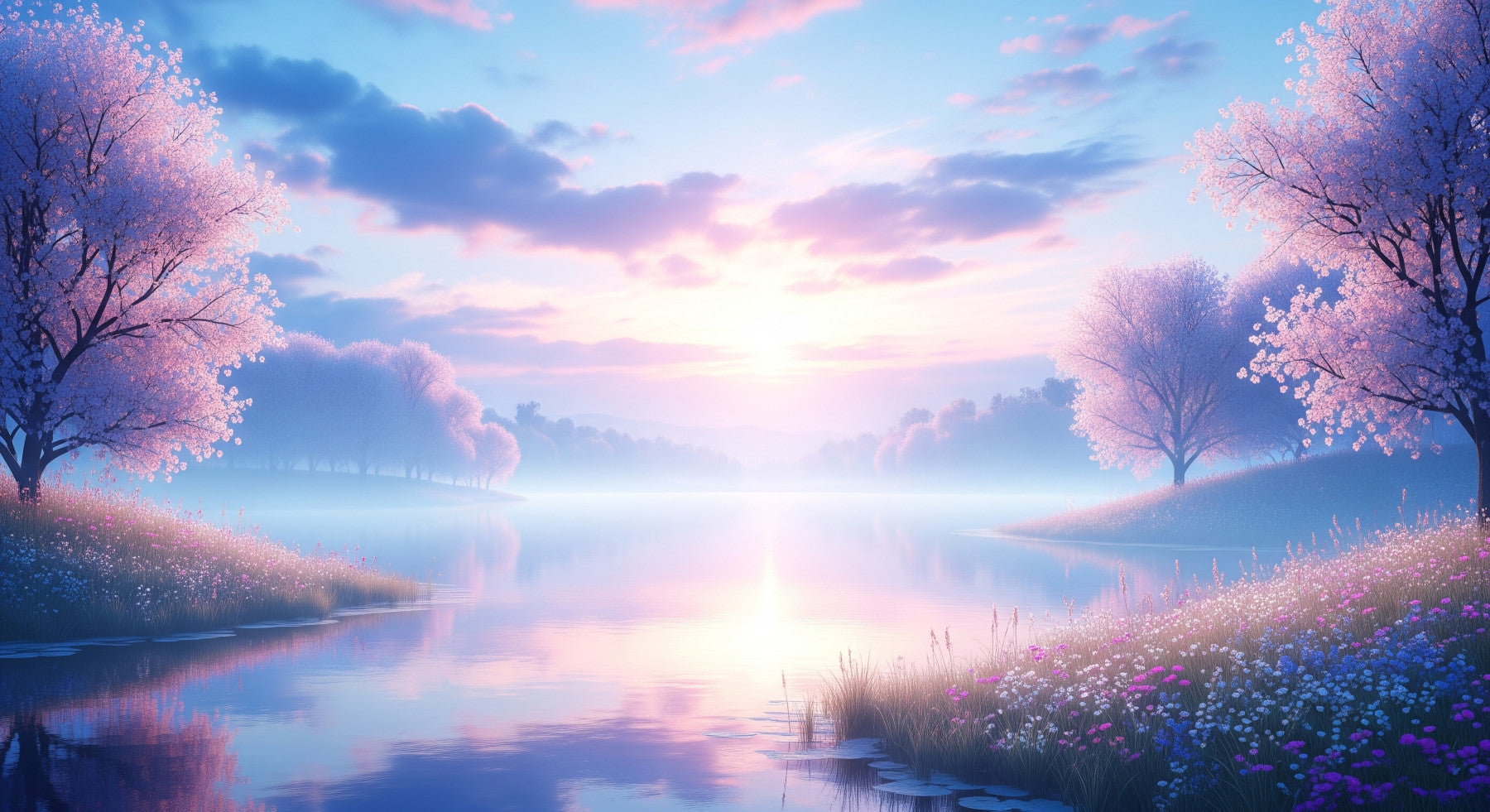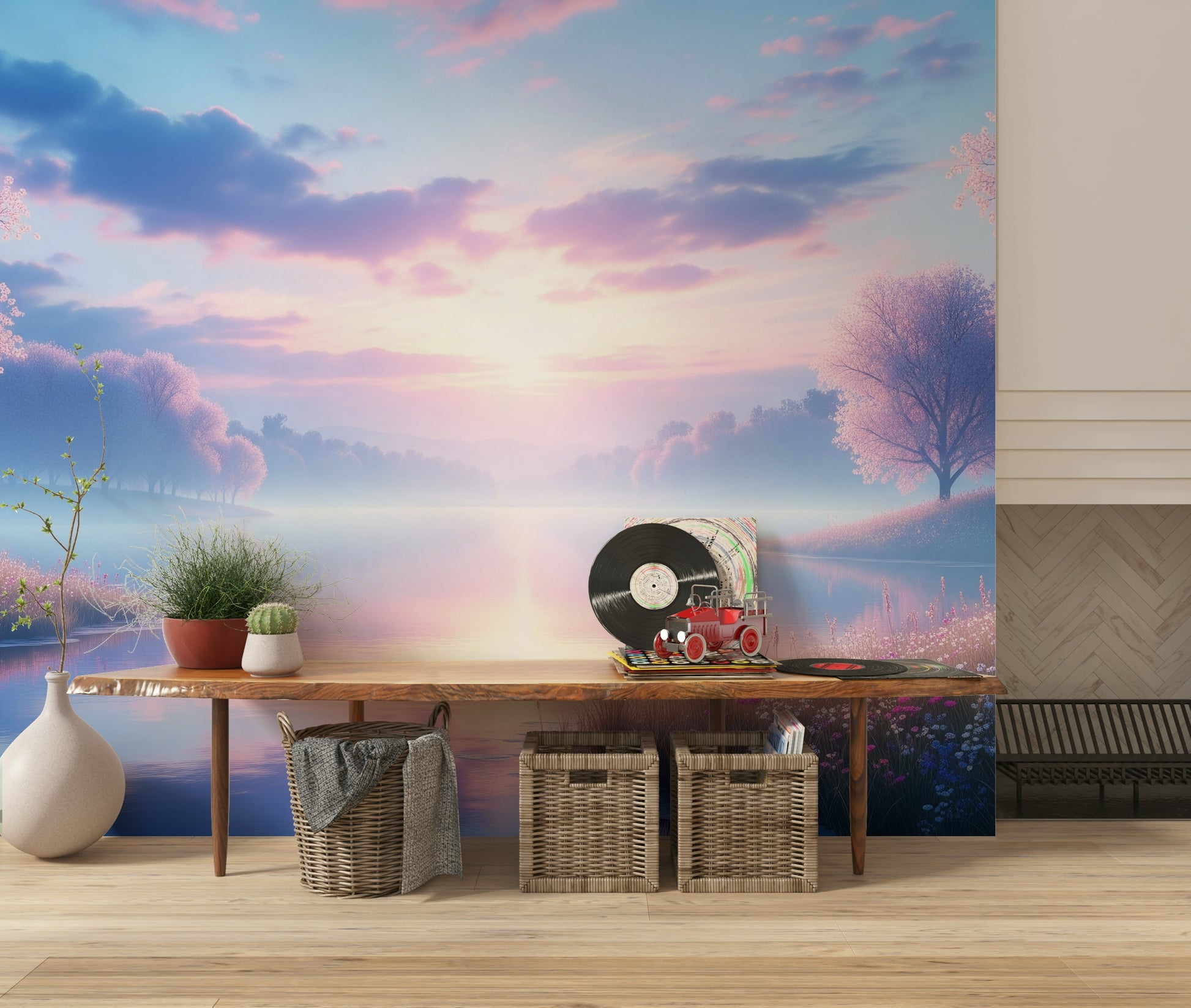 Infuse your rooms with the tranquility of a lakeside dawn with this beautiful wallpaper for walls. Delicate pink blossoms frame a serene lake, capturing a sense of calm and peacefulness. The design presents an ideal backdrop for bedrooms, living rooms, or reading nooks. The soft colour scheme brings a touch of elegance and warmth, while the balanced composition evokes a soothing atmosphere. This wallpaper enhances your interior décor by creating a focal point that is both visually appealing and emotionally comforting, perfect for those seeking a peaceful retreat within your home.