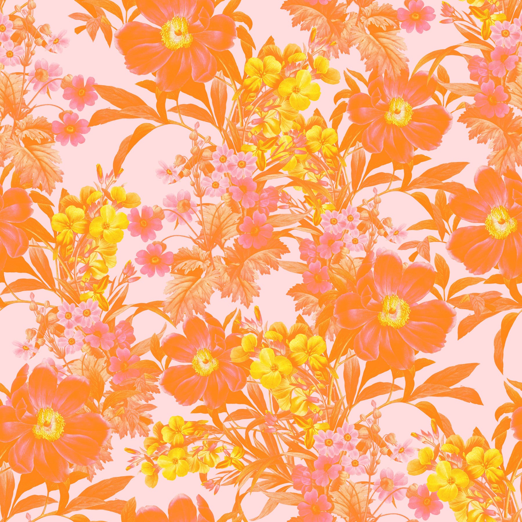 Immerse yourself in a world of floral splendor with this captivating wallpaper for walls. A seamless display of bright orange, yellow and pink flowers creates a radiant botanical print. The striking design is ideal for making a bold statement in a living room, brightening up a hallway, or adding charm to a bedroom. These vibrant botanical elements bring energy to any space. Let this delightful pattern infuse your home with the charm of a flourishing garden, creating an inviting atmosphere that is both refreshing and uplifting.