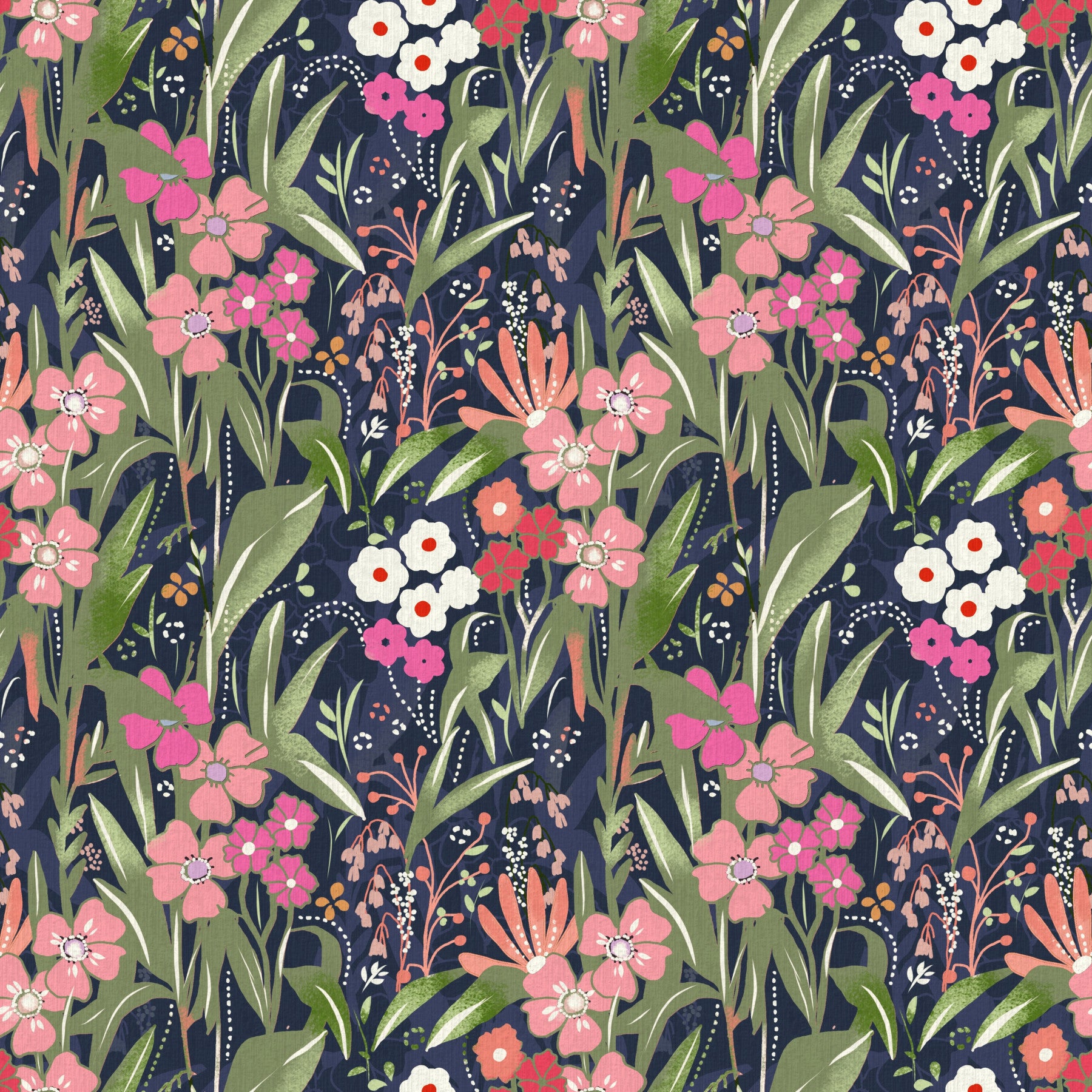Bring the garden indoors with this vibrant floral design. The deep blue background allows the pink, red, and white flowers to pop, creating a refreshing atmosphere. Green foliage adds a touch of serenity. Install this wallpaper for walls in bedrooms or living rooms to add colour and style. The pattern complements both modern and traditional interiors, adding an artistic touch.