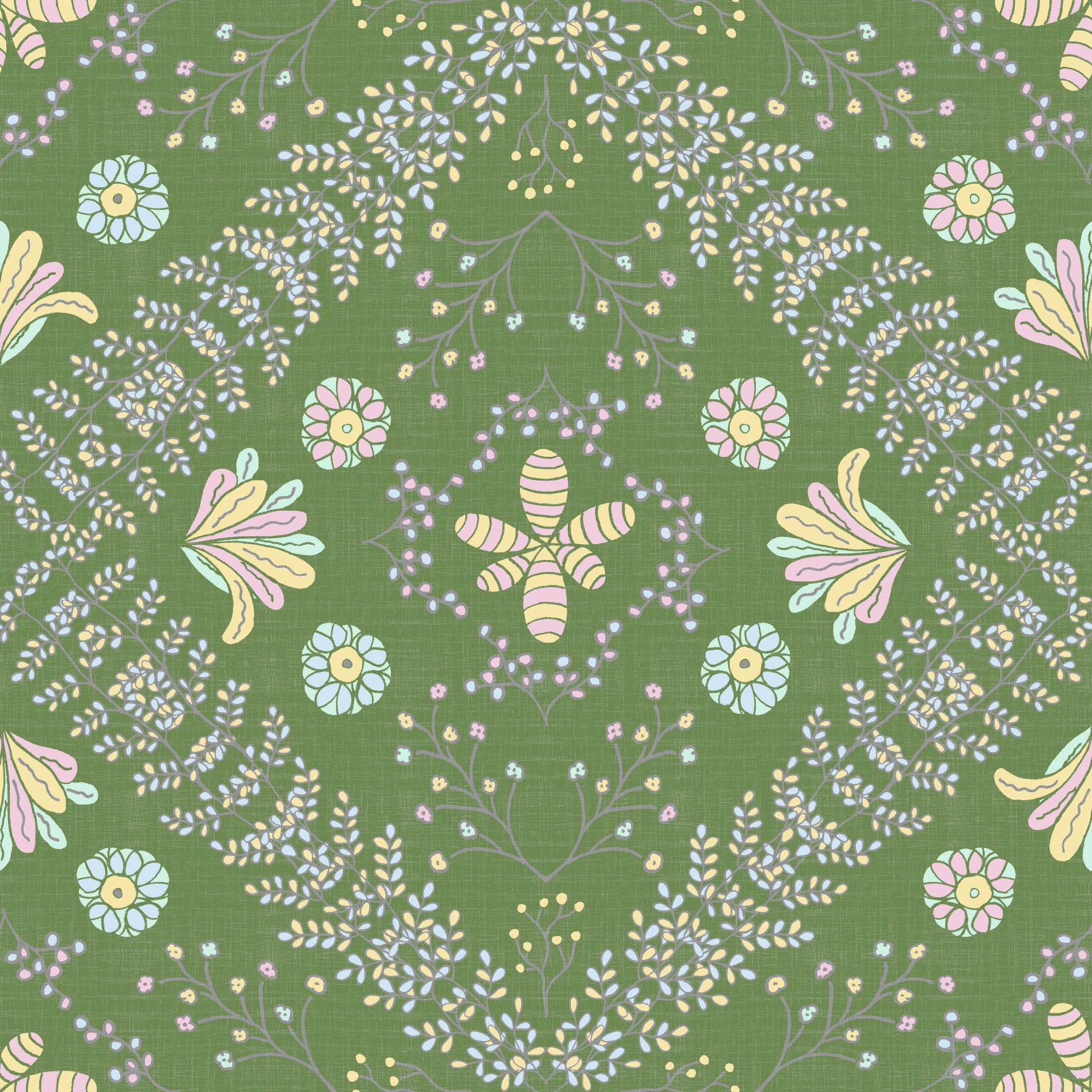 Decorate your space with the charming, vintage feel of our Bloom Tapestry Olive Green Wallpaper. This beautiful mural wallpaper features a repeating floral tapestry design on a soft olive green background. The delicate pattern, with its muted pastel tones of pink, blue, and yellow, gives your walls a gentle and peaceful look. It's the perfect wallpaper for walls in a bedroom, nursery, or cozy living room, offering a touch of rustic elegance.