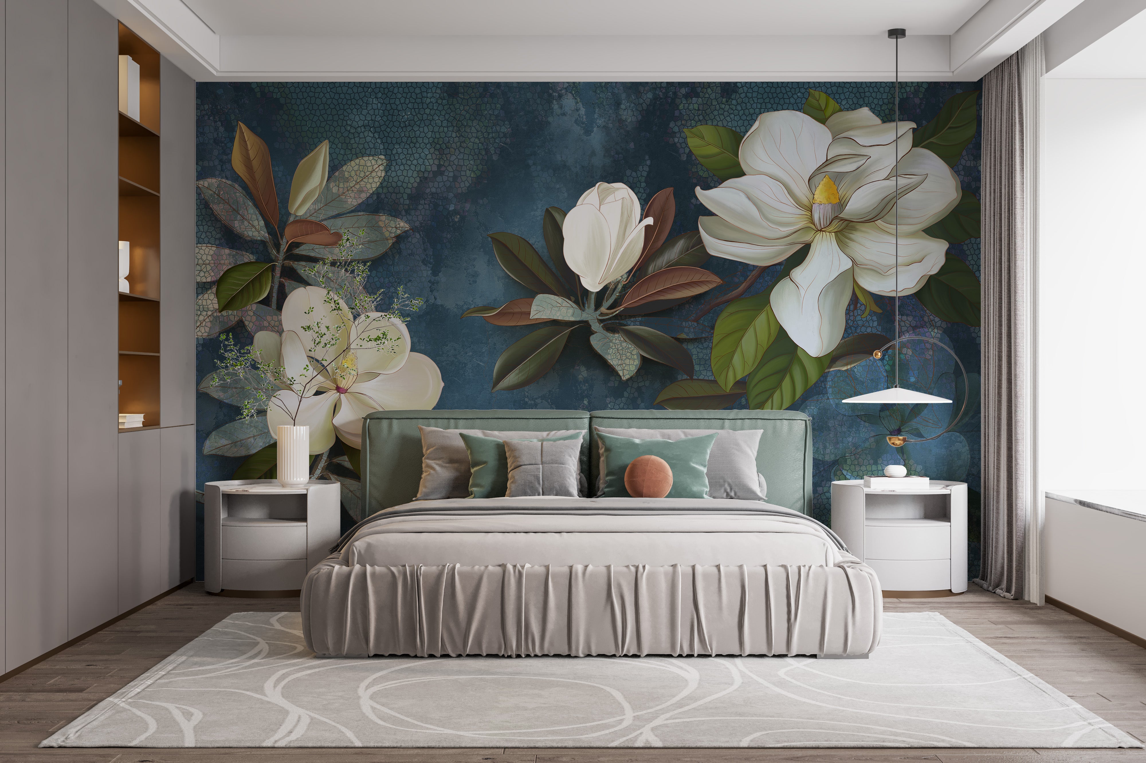 Imagine entering a room where the walls are adorned with a canvas of blooming magnolia flowers in brilliant shades of blue and white. The effect is simply breathtaking and transports you to a tranquil paradise. Flower wallpapers have always been popular among art enthusiasts, and the bloomy blue magnolia white flower mural wallpaper is a perfect example of why that is. It infuses a sense of serenity and freshness into any space, making it feel more alive. The mural's details are intricately crafted, with every petal and every stem delicately designed to create a work of art that feels alive. It's the perfect backdrop for any space that requires a creative touch.