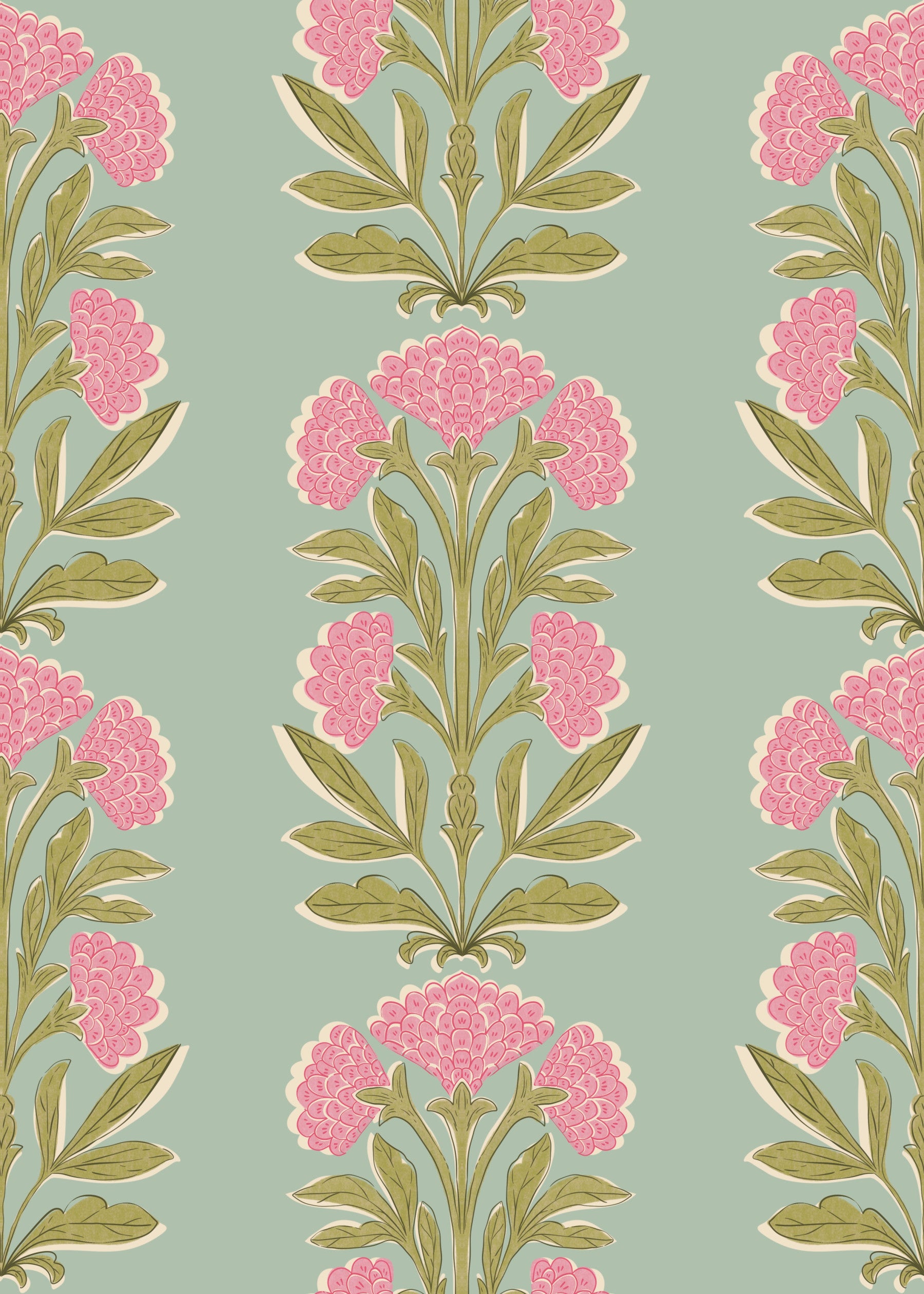 Elevate your space with this delightful floral pattern, a captivating wallpaper for walls. This design features a balanced arrangement of pink stylized blossoms and green leaves against a soft blue backdrop. The classic botanical motif adds a touch of serenity. It works beautifully in living rooms, bedrooms, or dining areas. The muted colours create a soothing atmosphere, ideal for creating a tranquil sanctuary. This wallpaper design complements various interiors, from contemporary to traditional, offering a refined and stylish touch.