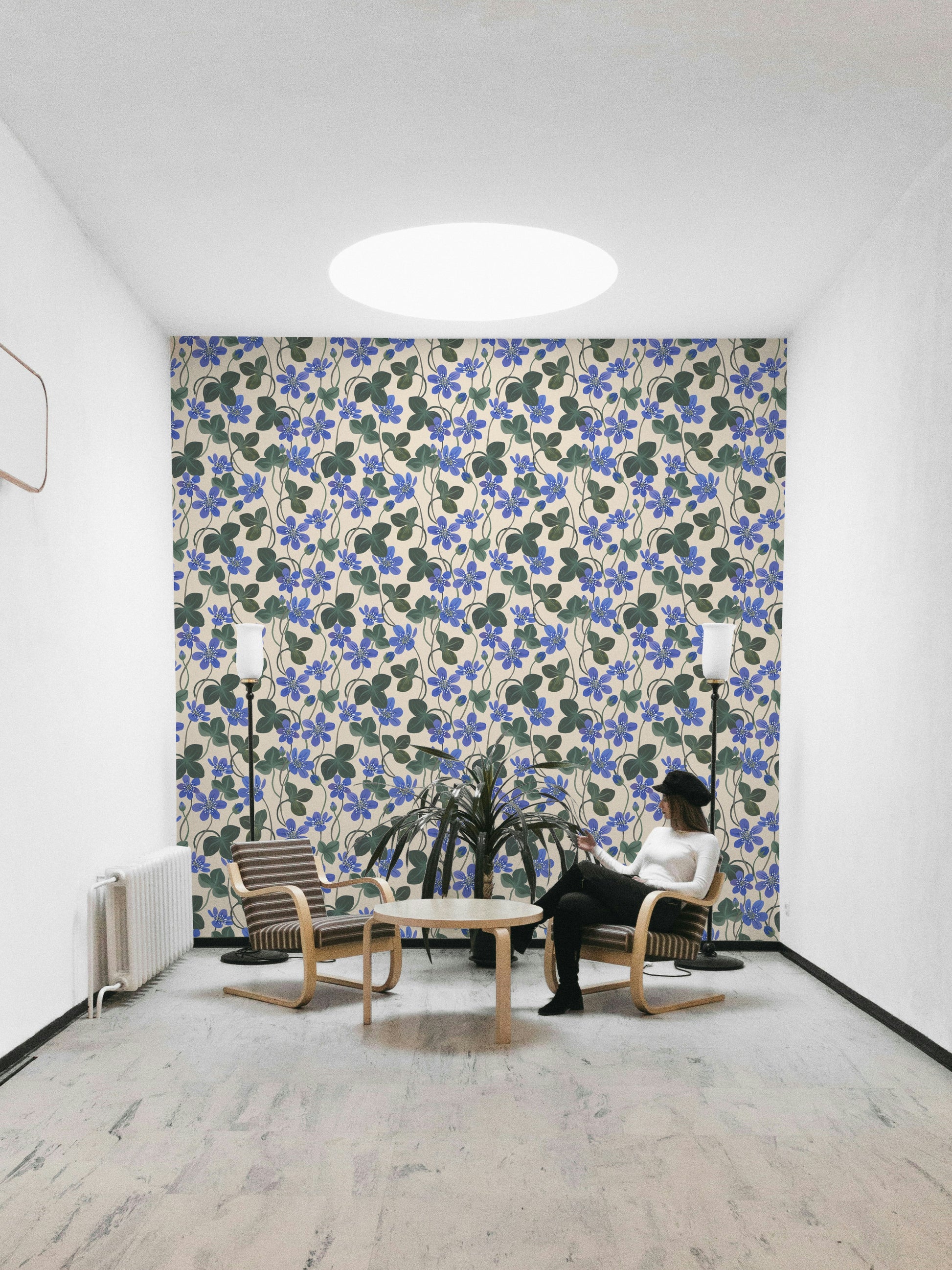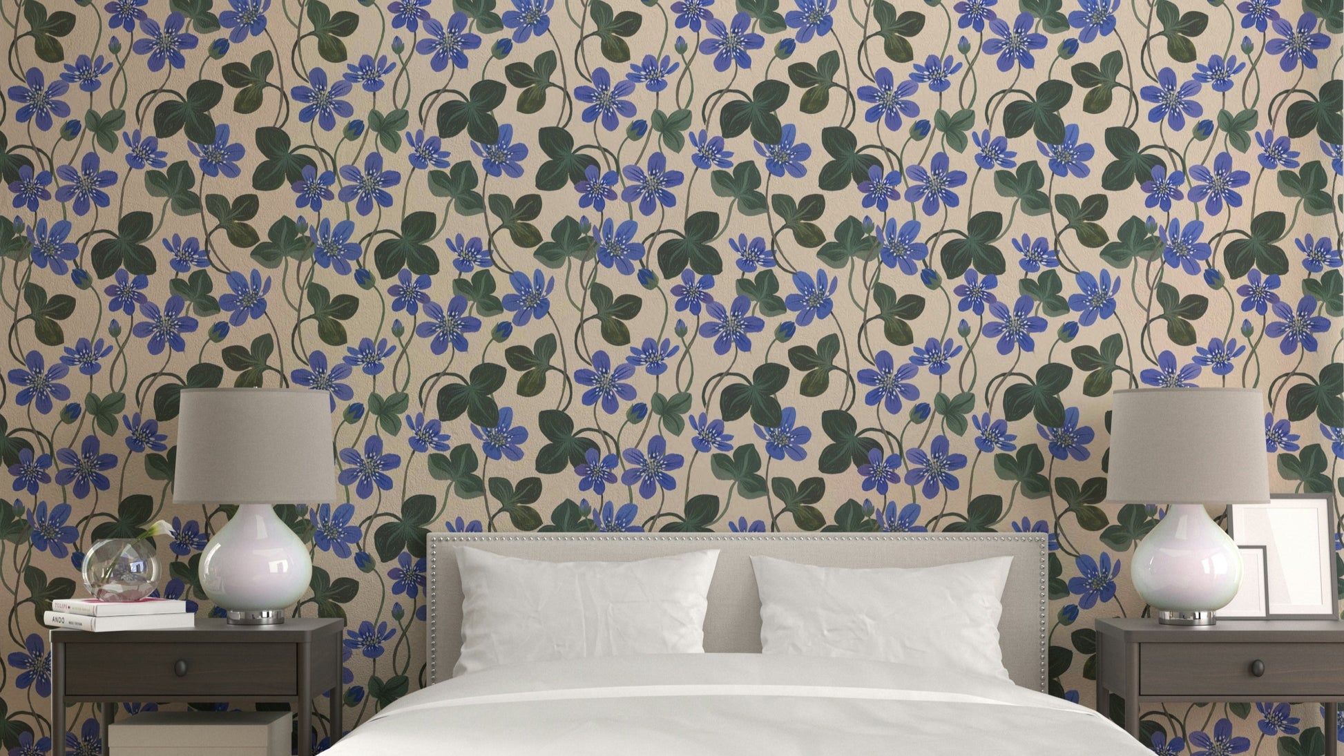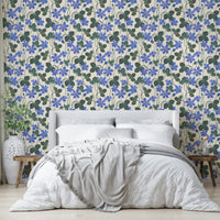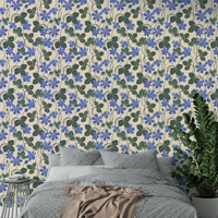 Embrace the serene beauty of 'Blue Anemone,' a captivating wallpaper featuring a delicate watercolor-esque pattern. Vivid blue anemones, rendered with artistic brushstrokes, bloom gracefully against a soft, creamy backdrop. The lush green foliage adds depth and contrast, creating a tranquil and elegant design perfect for any space. This floral pattern evokes a sense of calm and natural beauty, offering a refreshing and sophisticated aesthetic to your digital devices.