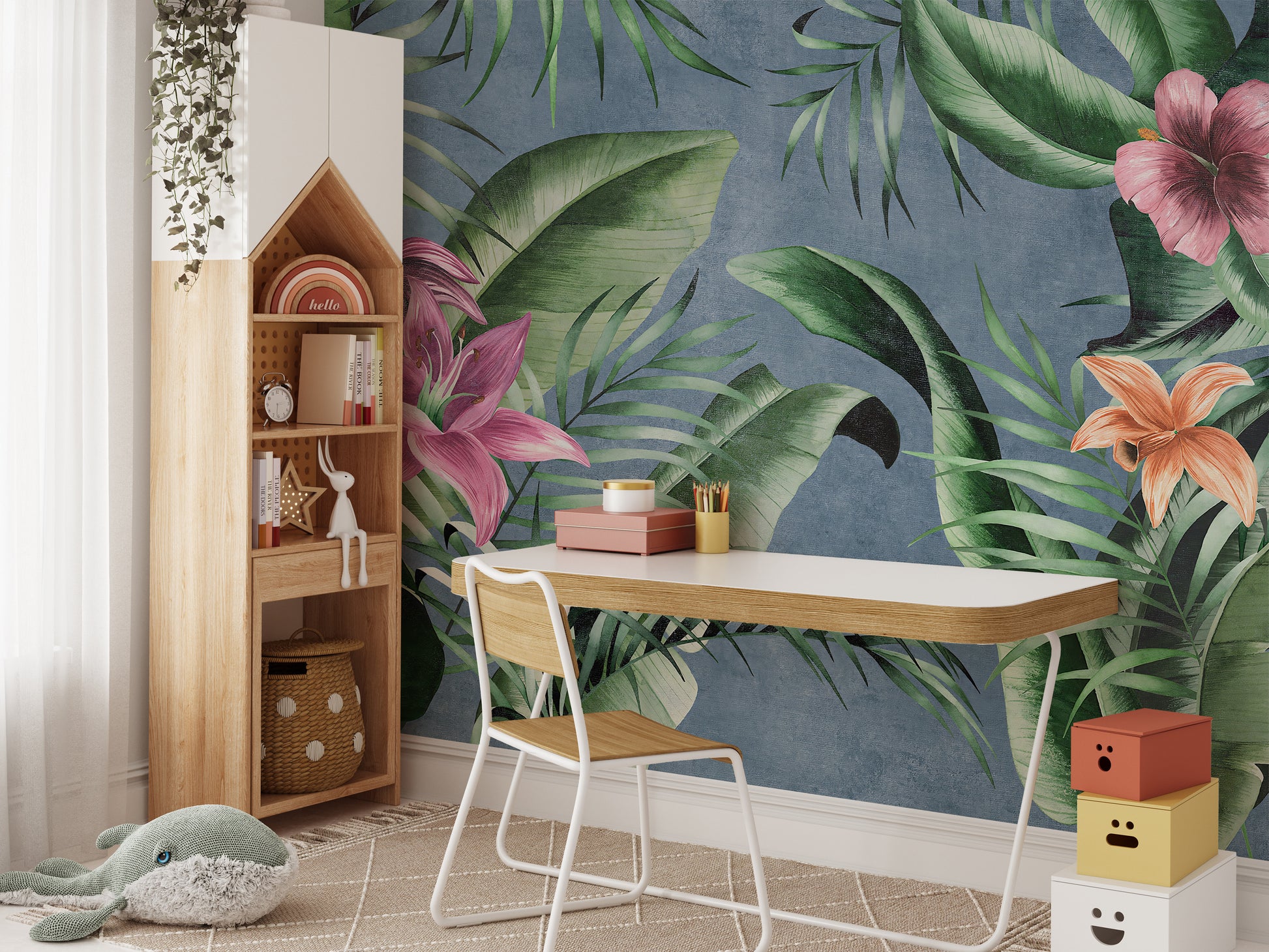 This stunning mural wallpaper will transport you to an oasis of lush greenery with vibrant leaves and delicate florals. Bold splashes of blue provide the perfect backdrop for the large green leaves to pop, making this wallpaper a statement piece in any room. Whether you're looking to create a calming atmosphere in your bedroom or bring some life to your living space, this leaves wallpaper is sure to impress. The intricate details and botanical motifs of this green wallpaper add an element of luxury and sophistication to any interior design scheme, effortlessly elevating your home decor. With its timeless appeal and versatile styling options, this floral wallpaper is a must-have for any nature lover looking to add personality to their walls.