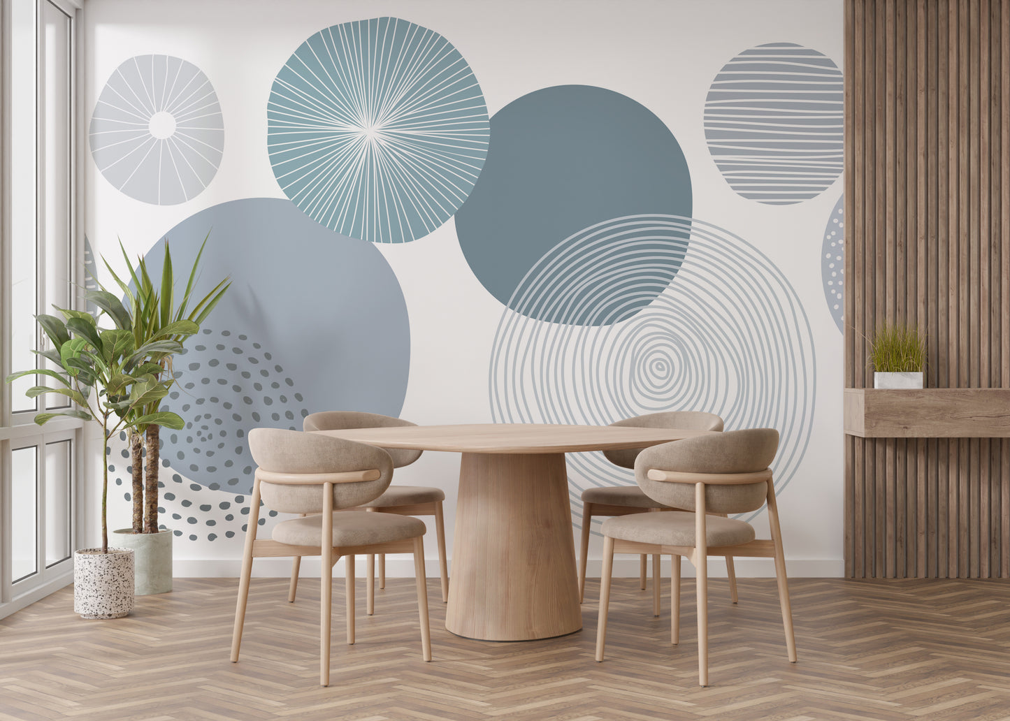 Contemporary blue abstract wallpaper with dynamic circle patterns.