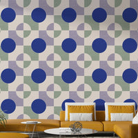 A sophisticated and calming wallpaper featuring a bold blue circle as its centerpiece. The circle is set against a backdrop of soft, muted greens, lavenders, and beiges, all rendered with a subtle linen texture. The interplay of shapes and colors creates a visually interesting yet peaceful design. This wallpaper is versatile enough for a bedroom, living room, or office, enhancing the space with its muted elegance and subtle modern appeal.