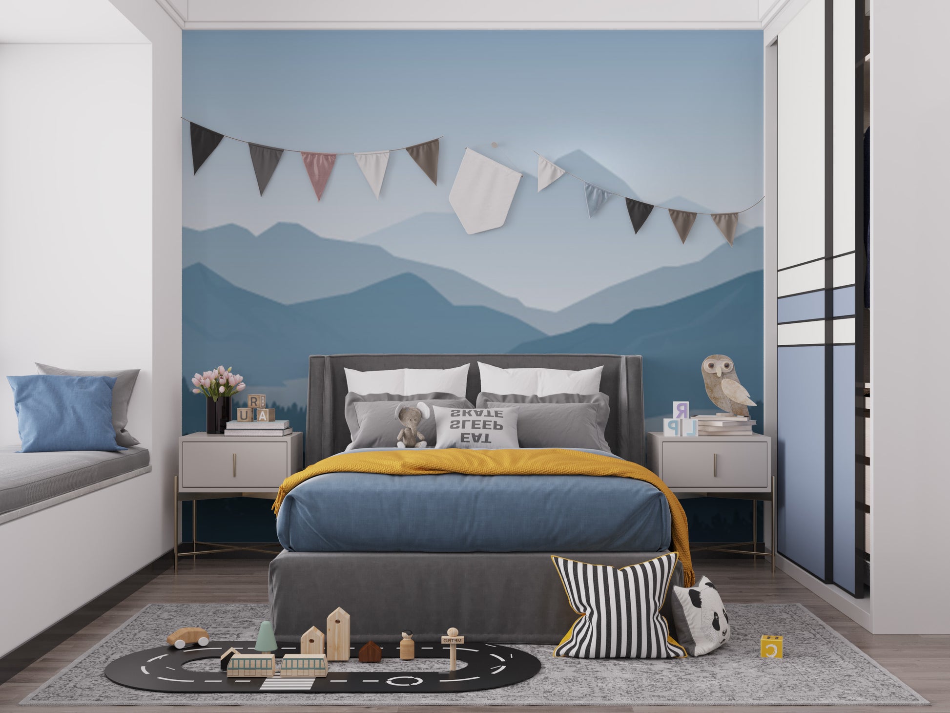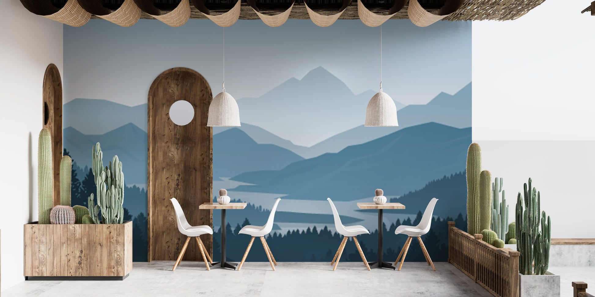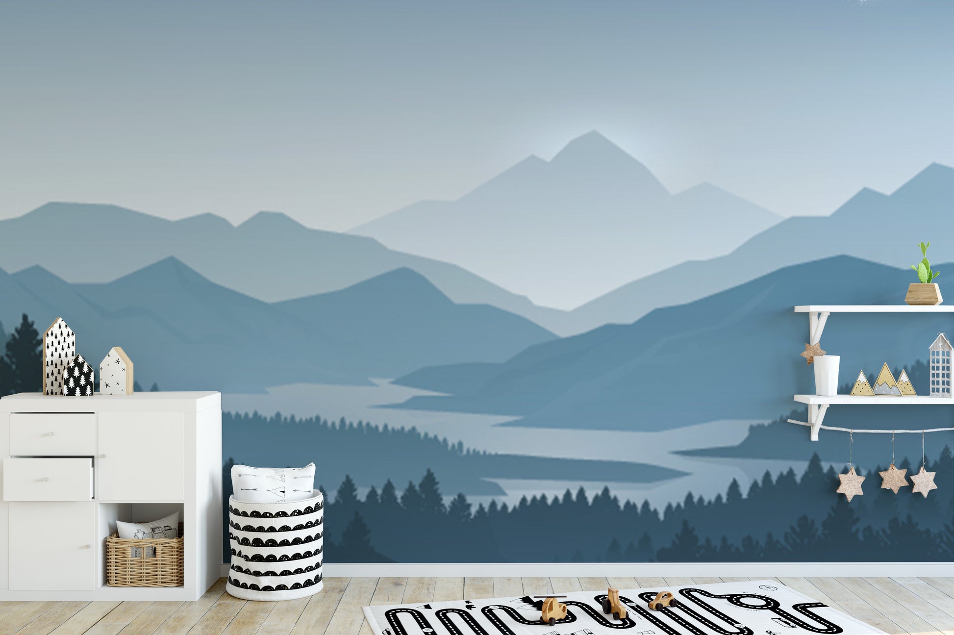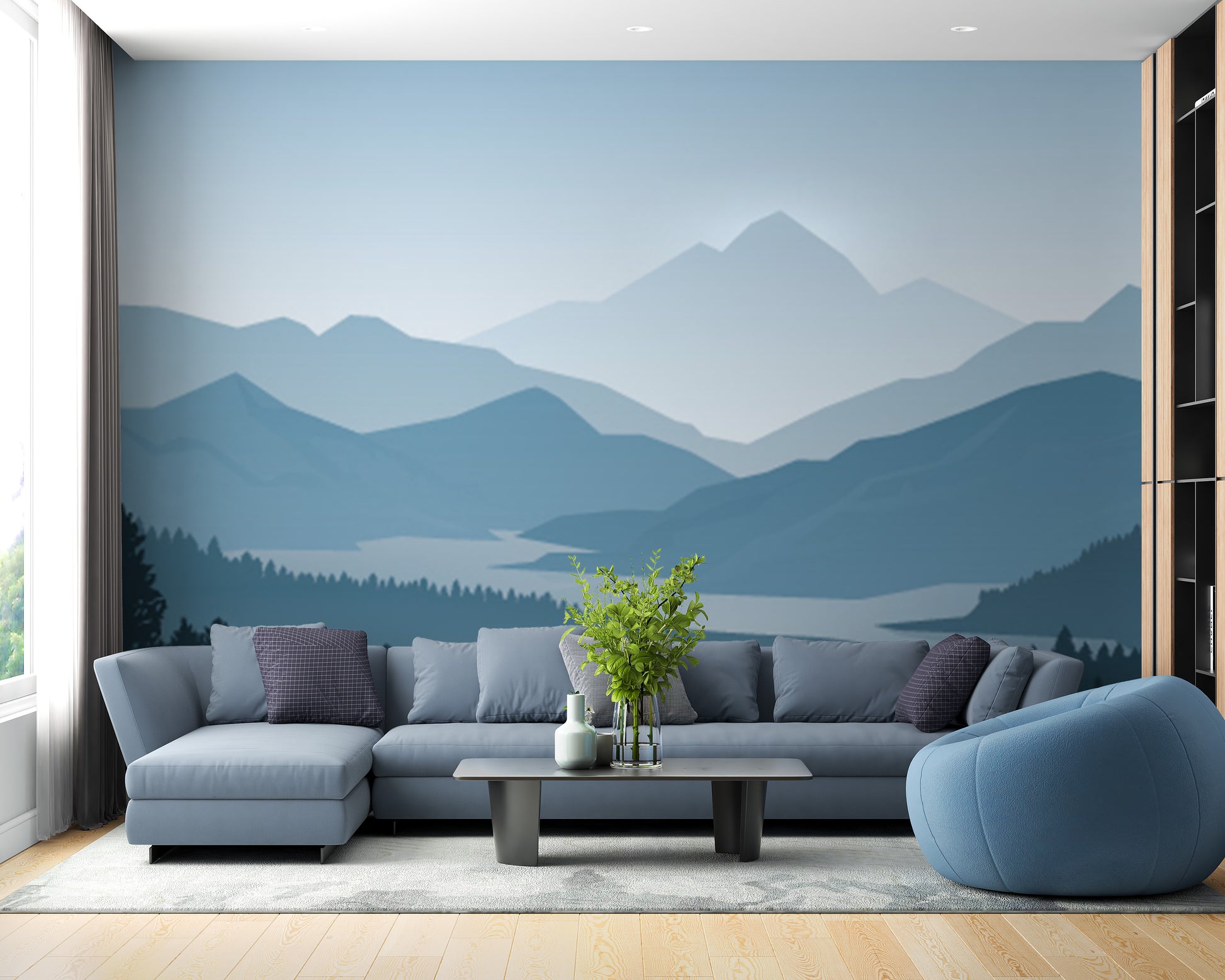 Nature-inspired blue mountain forest wallpaper mural