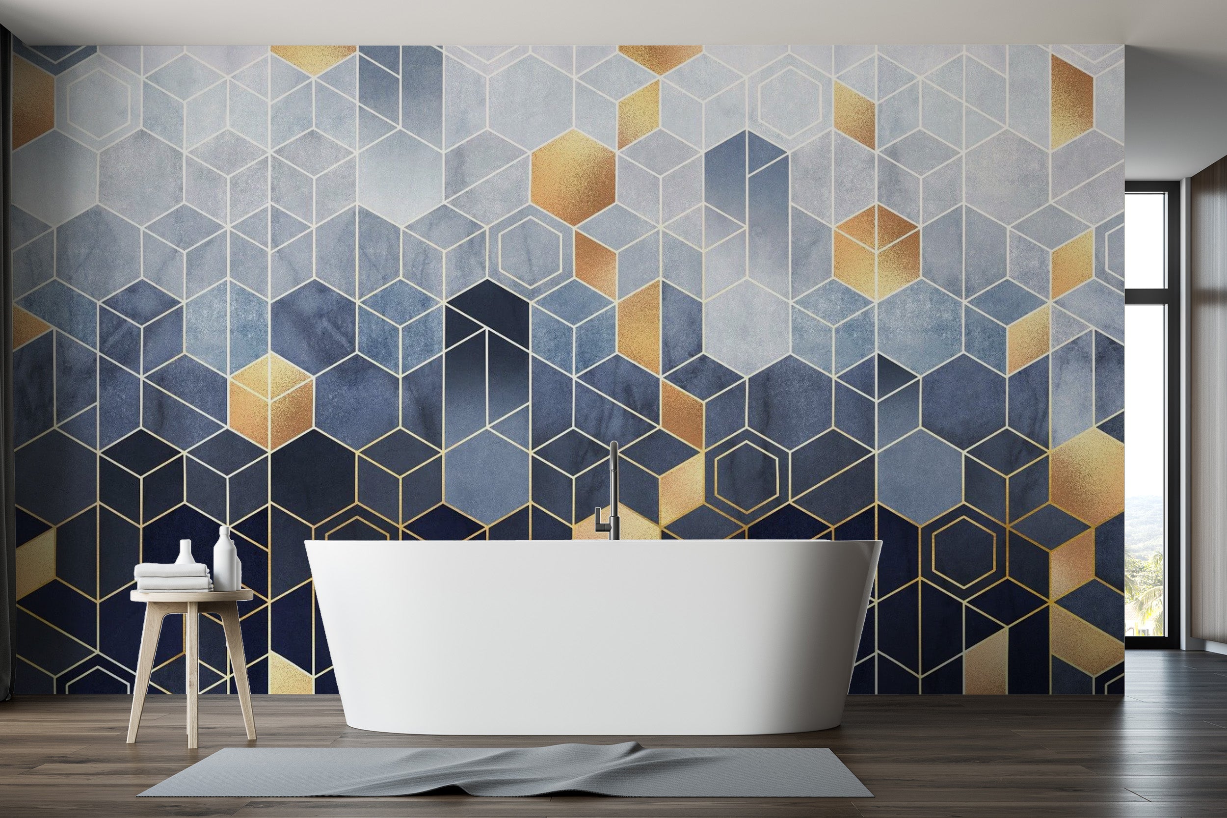 Step into a world of elegance with our hexagonal ombre gold wallpaper mural. As a leading Wallpaper Company, we're excited to offer you this stunning piece that effortlessly blends geometric charm with a luxurious aura. The wallpaper features a unique hexagonal pattern adorned with ombre shades of blue and gold accents. These elements combine to create a 3D effect that captivates and elevates any space. The gold touches not only add a luxe effect but also bring a sense of warmth and luxury. Made from 100% natural materials, this eco-friendly wallpaper is a testament to style and sustainability.