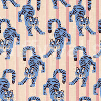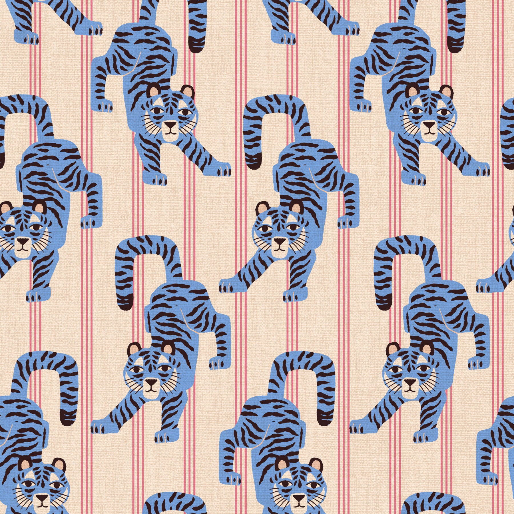 Bring a touch of playful elegance to your screen with this vibrant wallpaper. Stylized blue tigers, their dark stripes contrasting beautifully against their azure coats, playfully stretch and leap across a backdrop of delicate pink stripes on a beige linen texture. This design captures the energy and grace of these magnificent creatures within a jewel-toned jungle aesthetic. The repeating pattern creates a dynamic yet calming effect, perfect for adding a unique and stylish touch to any device. The whimsical charm of the blue tigers and the subtle sophistication of the striped background blend seamlessly for a captivating and eye-catching wallpaper experience.