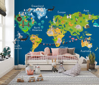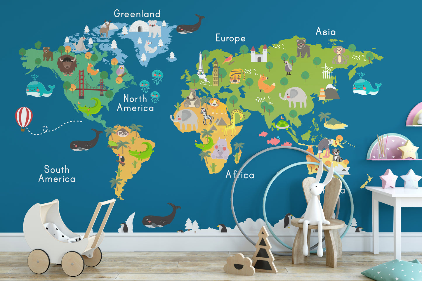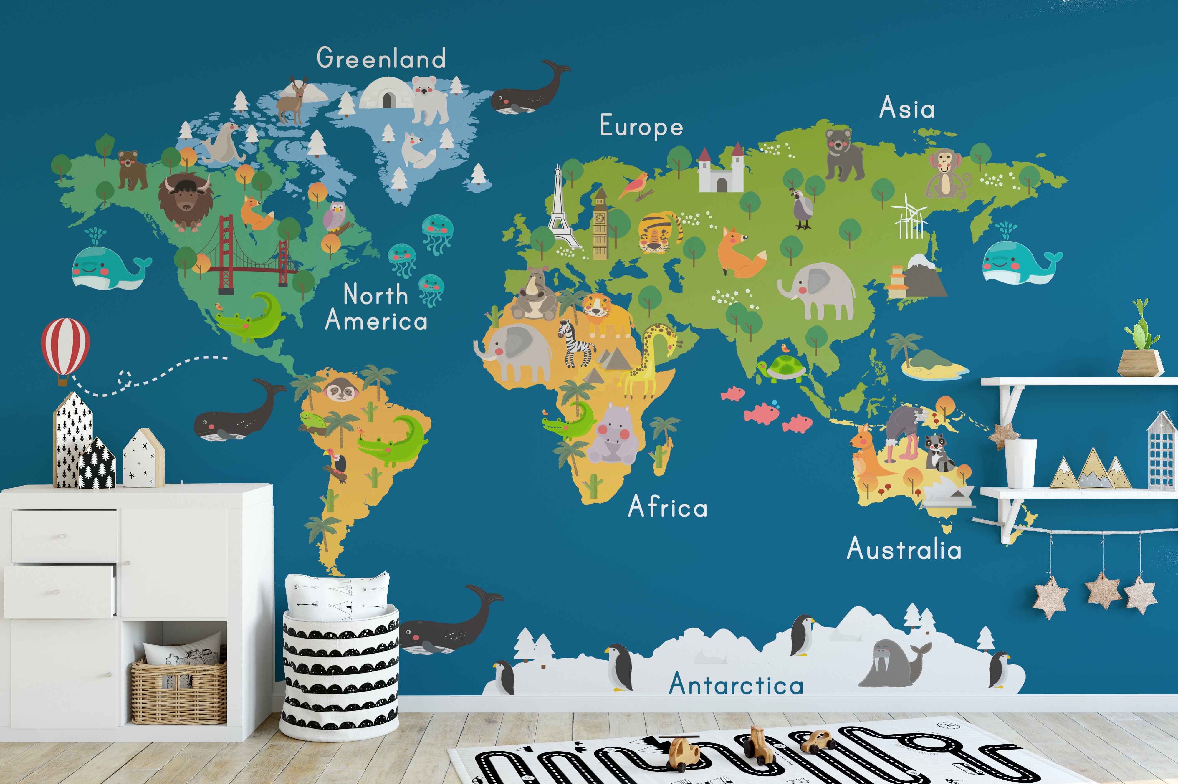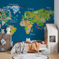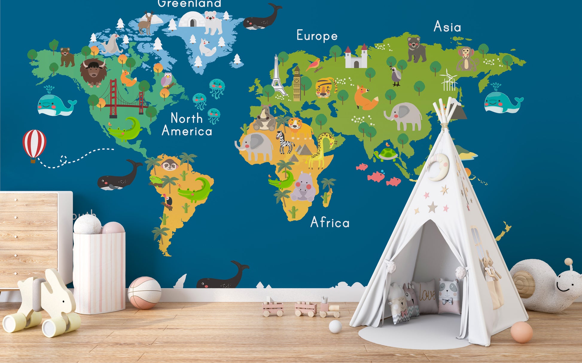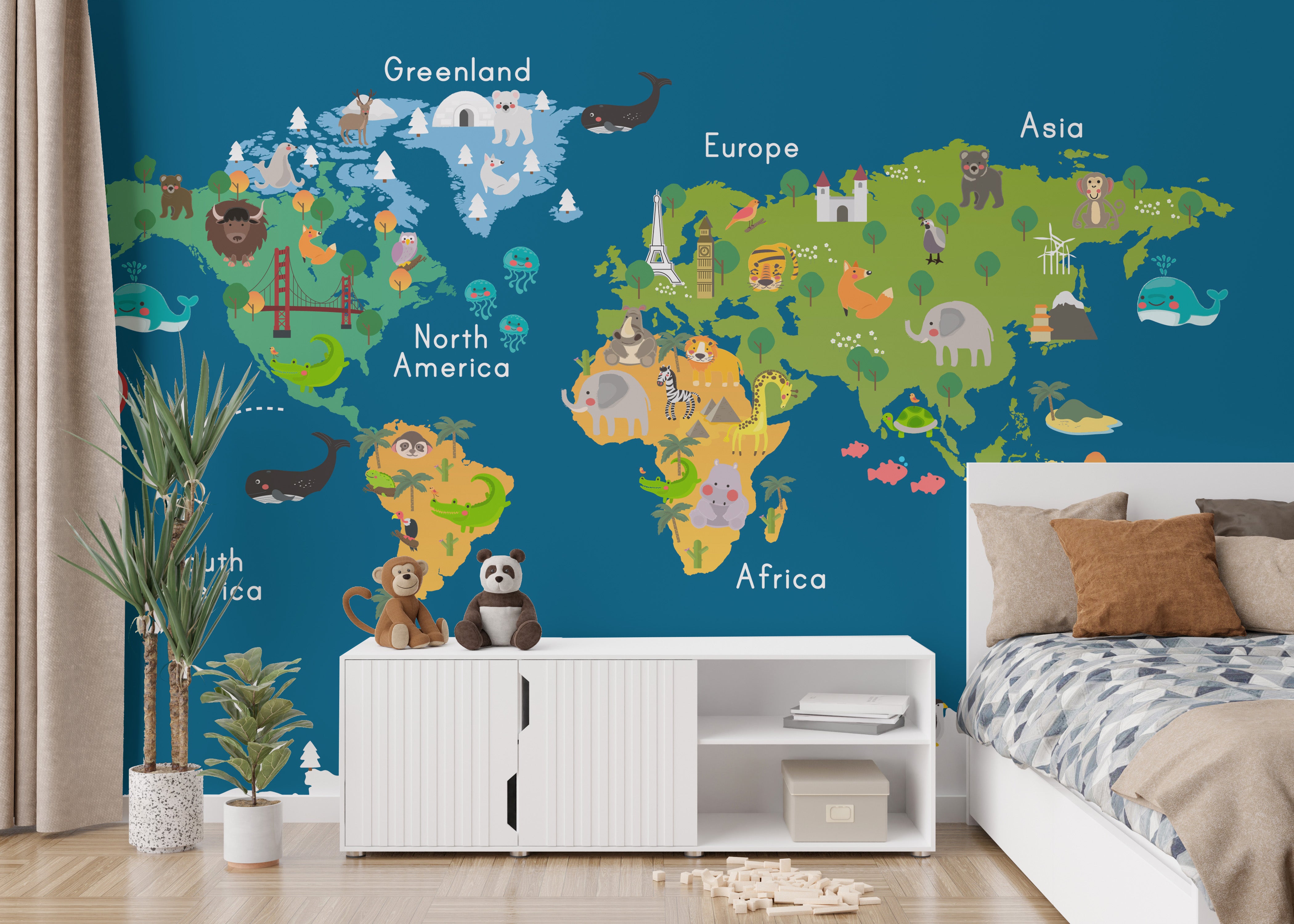 Discover the perfect addition to your child's bedroom with this amazing blue kids world map wallpaper mural! This vibrant wallpaper is sure to bring life and a playful vibe to your kid's room. It features cheerful cartoon flags from around the world, making it a fun way to teach your little one about different countries and cultures. The pastel colors add a fresh touch to any nursery, playroom, or children’s bedroom and set the stage for endless imaginative adventures. Our blue kids world map animal wallpaper Mural can completely transform any space in your home. It is perfect for interior designers looking for a creative way to spruce up any wall. It will also make an ideal housewarming or birthday gift! Don't wait, get yours now and fill your child's room with color, wonder, and adventure!