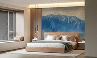 This mountain scene brings a serene, cool atmosphere to any room. The design features a textured landscape in various shades of blue against a neutral backdrop. The subtle gradient and detailed mountain range create a calming visual. Use this wallpaper for walls to add depth to living rooms, bedrooms, or offices. It pairs well with modern or rustic decor. Enjoy a touch of nature indoors.