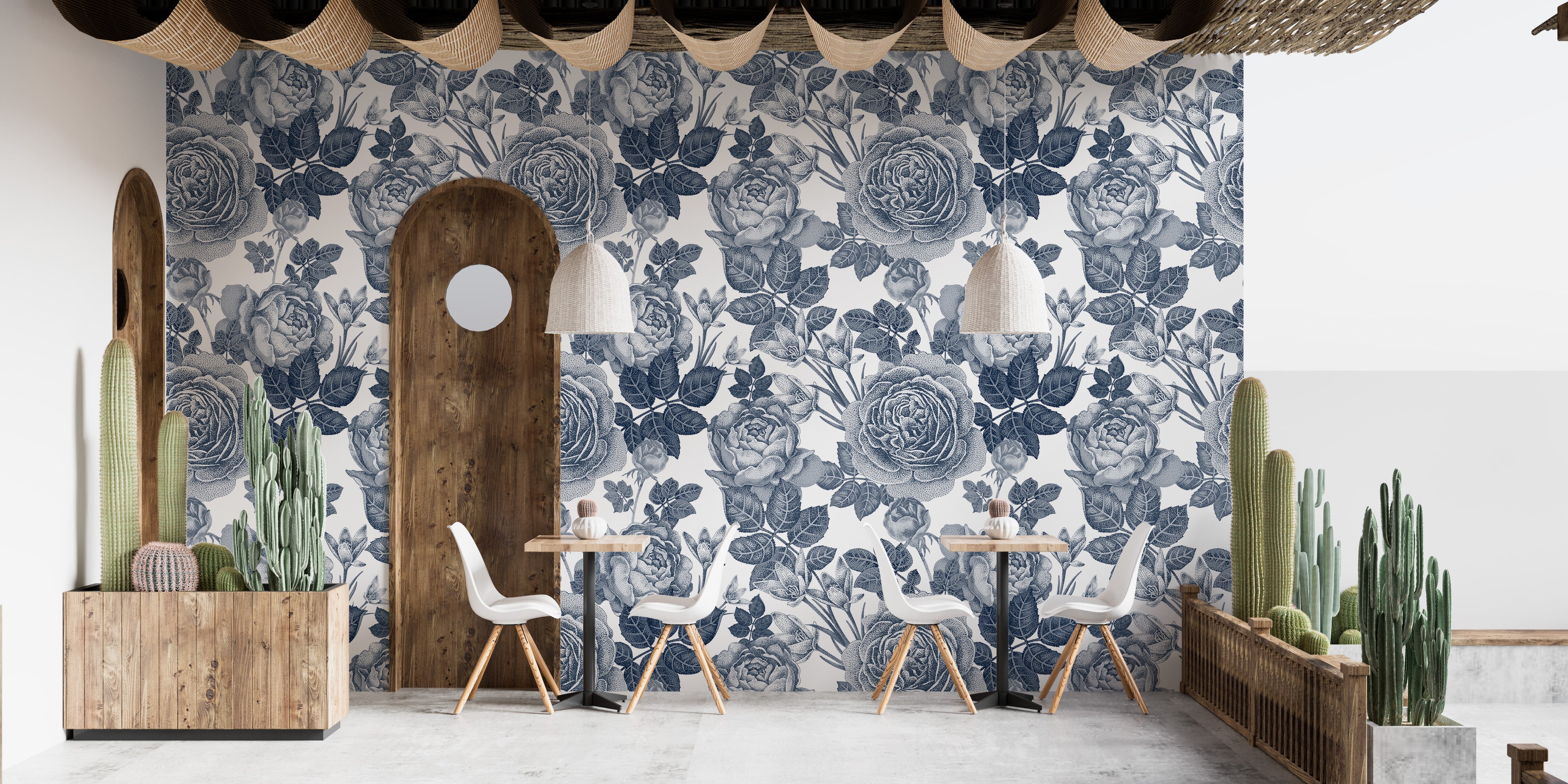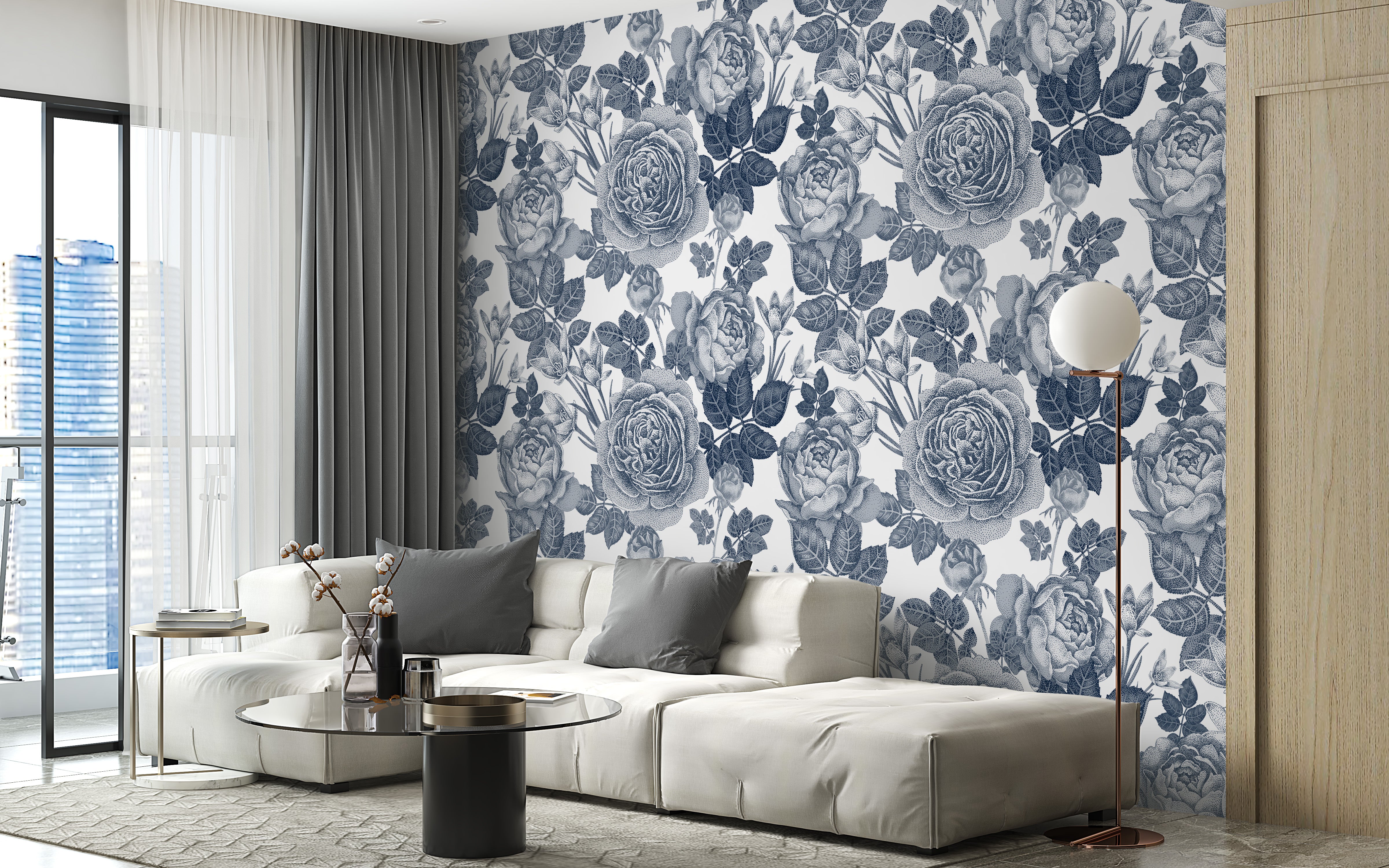 Transform your surroundings with the exquisite floral artistry of the midnight bloom blue flower wallpaper. Its intricately designed, non-repetitive floral pattern showcases elegant blue peonies and roses on a stunning royal blue backdrop. The wallpaper brings to life vintage botanical engravings, “twilight rose garden” celebrates the beauty of small petals and verdant foliage while providing a peaceful feel. Fitting the bill where artistry meets minimalistic decor, the wallpaper is perfect for any space. This timeless floral wallpaper is perfect for spring-themed interiors where modern geometry meets traditional artistry, nature is infused within the dwelling.