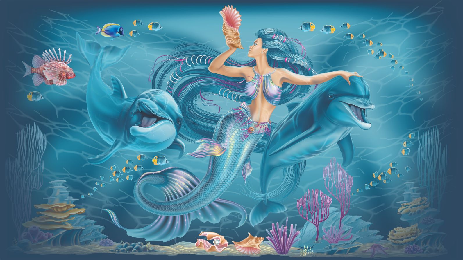 Blue ocean-themed mermaid wallpaper with coral reefs.