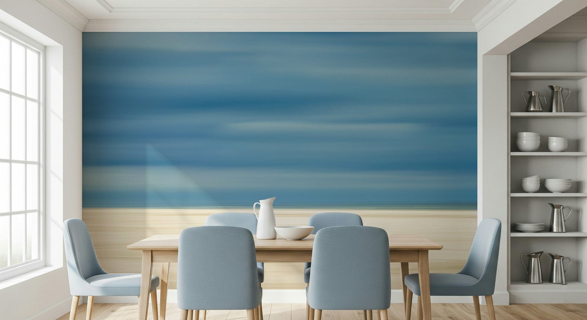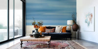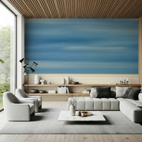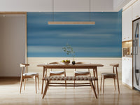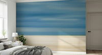 Drift into tranquility with this abstract beach scene. The design uses horizontal lines of muted blues and beige to evoke the feeling of sand, sea, and sky. This wallpaper for walls brings a calming presence into any room. Picture it in a bedroom to create a serene escape, a living room for relaxed gatherings, or a home office for a stress-free workspace. It complements both minimalist and coastal interiors, adding an artistic touch without overwhelming the space.