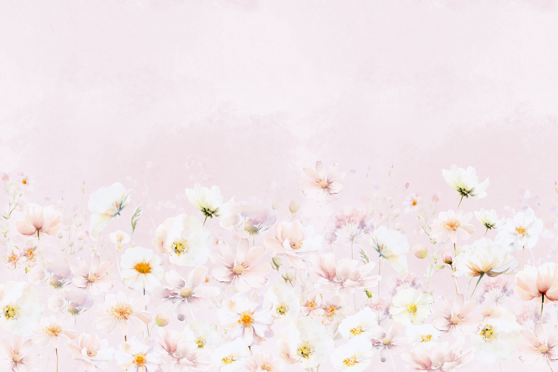 This wallpaper evokes a serene and romantic atmosphere with its delicate watercolor floral design. Soft blush pinks and creamy whites create a gentle color palette, perfect for bedrooms, nurseries, or any space needing a touch of calm. The flowers, rendered in a dreamy, slightly impressionistic style, appear to gently sway in a soft breeze. The light pink background enhances the overall feeling of tranquility, creating a soothing visual experience. The subtle details and naturalistic composition make it a versatile choice for various interior styles, from modern minimalist to classic romantic.