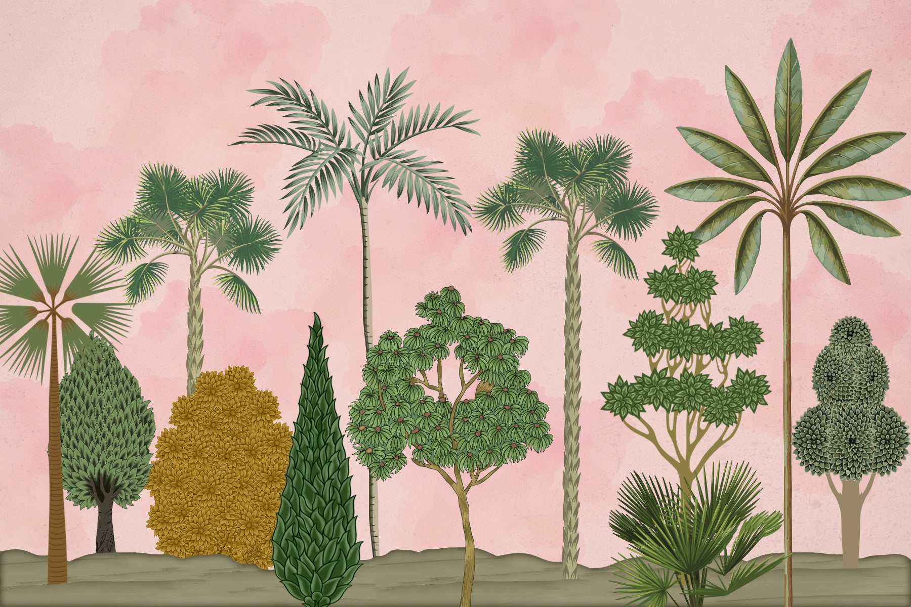 Enliven your walls with this dreamy botanical wallpaper. It presents various lush trees rendered in a serene palette of pink and green. Soft textures add depth to the design. Use this stunning wallpaper for walls to craft a relaxed atmosphere in a bedroom or hallway, or add a sophisticated touch to a living room. Its graceful composition enhances contemporary and traditional spaces alike, creating a beautiful, nature-inspired sanctuary.