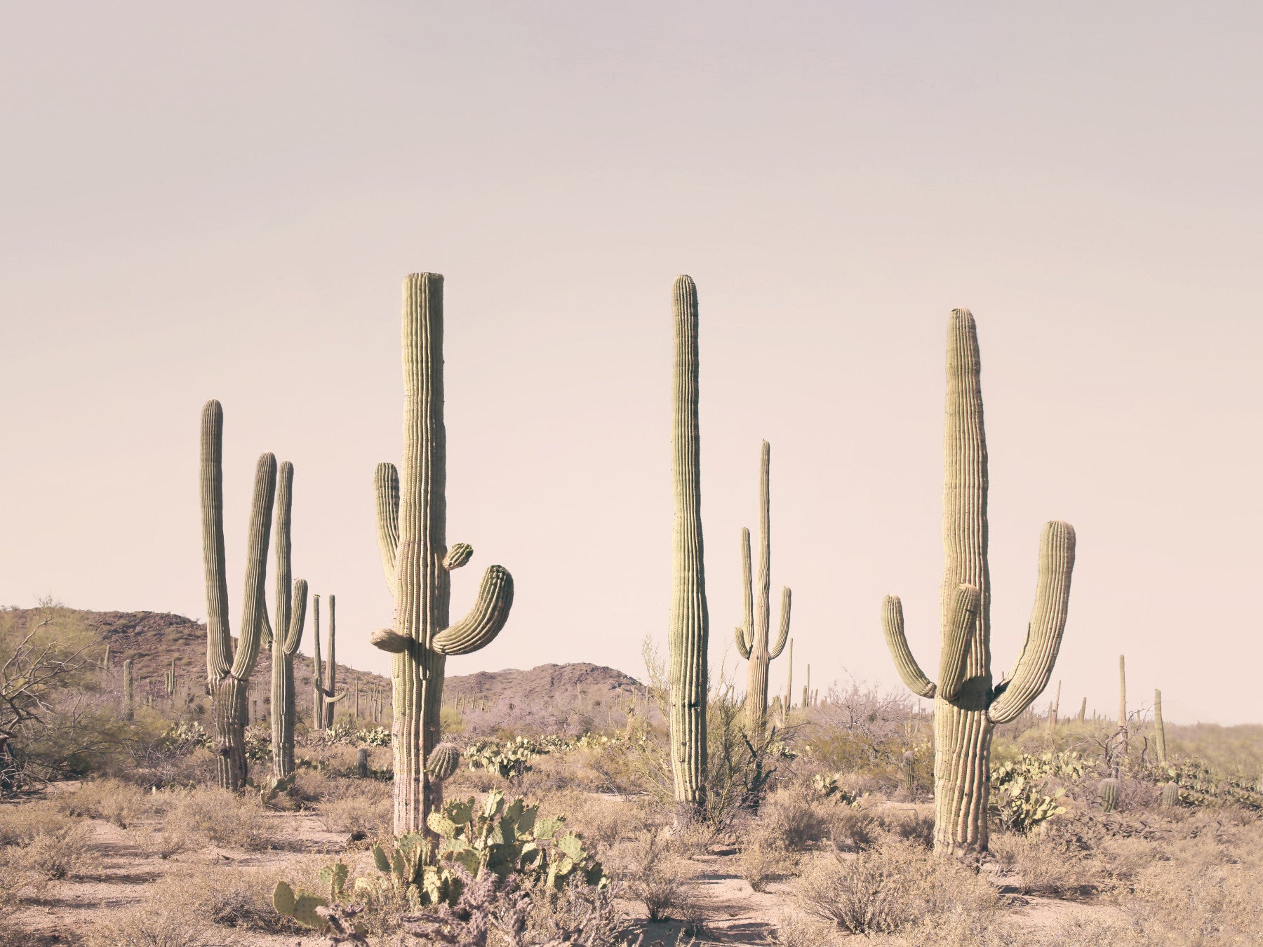Bathed in a soft, blush-toned light, this wallpaper showcases a breathtaking expanse of saguaro cacti. Towering sentinels of the desert, these majestic plants stand silhouetted against a pale sky, their textured forms creating a visually striking landscape. Smaller cacti and desert shrubs dot the foreground, adding depth and texture to the scene. The overall mood is serene and tranquil, evoking a sense of peace and the raw beauty of the desert wilderness. This minimalist desert scene offers a sophisticated and calming aesthetic, perfect for those seeking a touch of southwestern serenity in their digital spaces.