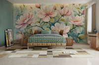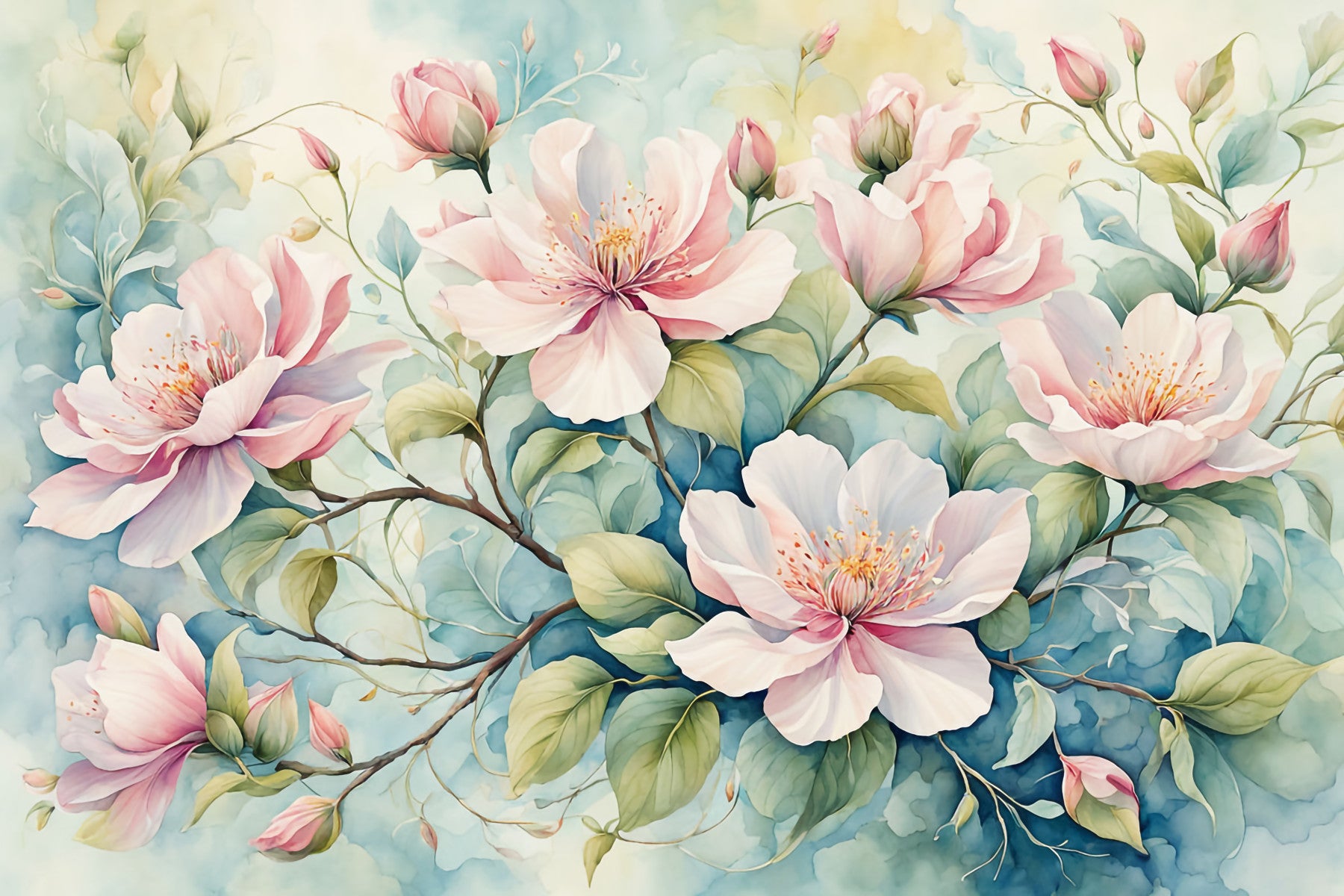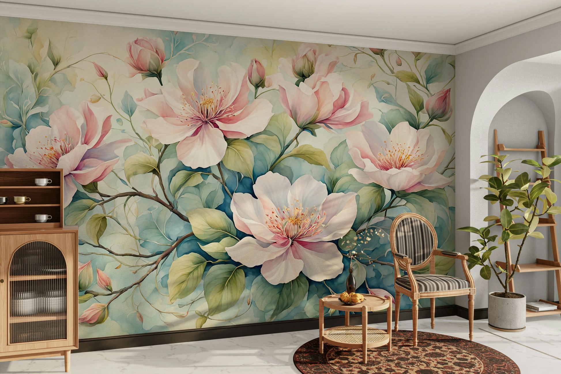 This wallpaper features a breathtaking watercolour painting of a blossoming branch, showcasing delicate pink and white flowers in full bloom. The artist's skill is evident in the subtle gradations of colour and the realistic portrayal of petals and leaves. The soft, muted tones of the background enhance the floral centrepiece, creating a serene and inviting ambiance. This wallpaper is ideal for bedrooms, living rooms, or any space requiring a touch of refined, natural beauty. Its calming effect makes it a perfect choice for relaxation and tranquility.