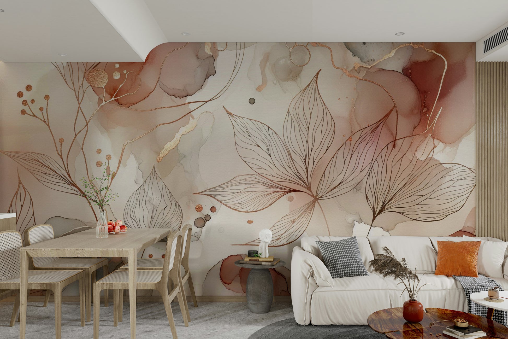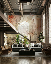 This wallpaper features a breathtaking blend of abstract watercolor washes in earthy tones of blush pink, terracotta, and soft beige, overlaid with delicate, hand-drawn botanical line art. The organic shapes of the watercolor create a sense of fluidity and movement, while the precise lines of the botanicals offer a counterpoint of structure and elegance. Gold accents add a touch of luxury and sophistication, making this wallpaper a perfect choice for creating a calming and stylish atmosphere in any room. The muted color palette promotes relaxation and tranquility, making it ideal for bedrooms, living rooms, or even meditation spaces. The design is both sophisticated and approachable, offering a subtle yet impactful visual statement.