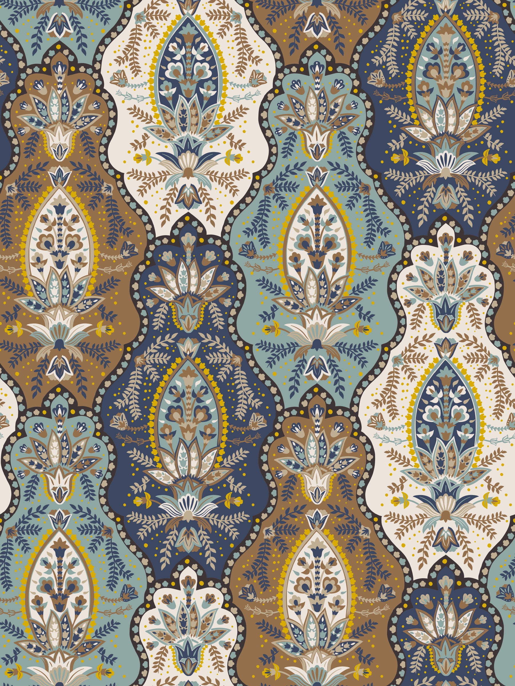 Patterned paisley wallpaper combining blue, mustard, teal, and cream for a boho look.