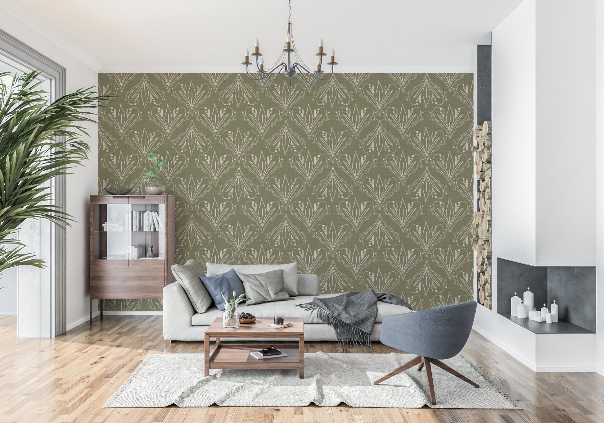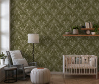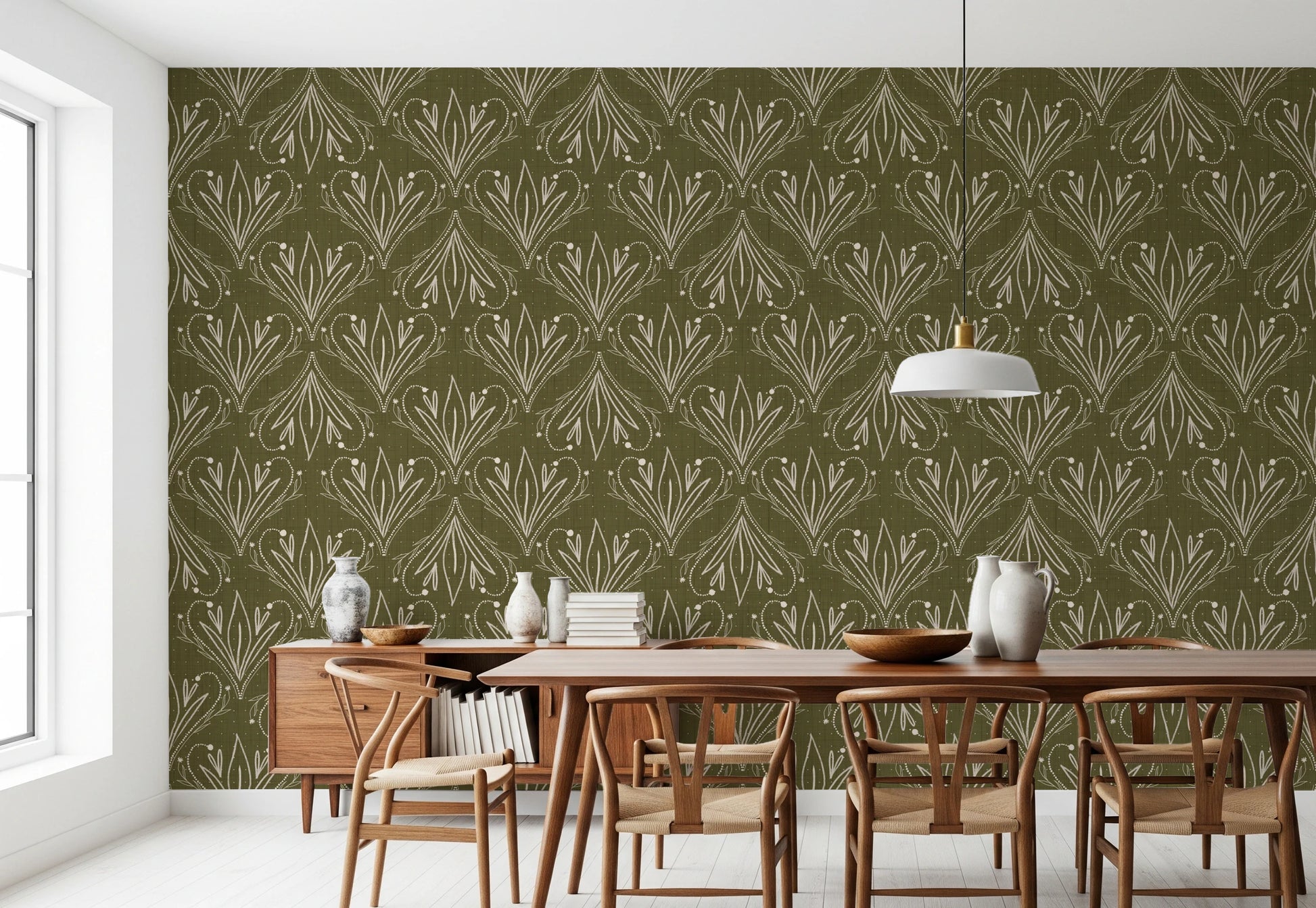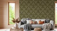 A hand-drawn boho folk floral wallpaper inspired by Art Nouveau elegance, featuring earthy olive green tones and retro botanical charm. This organic pattern brings balance, warmth and natural sophistication to interiors, making it ideal for feature walls in living rooms, bedrooms, offices, studios and boutique spaces.