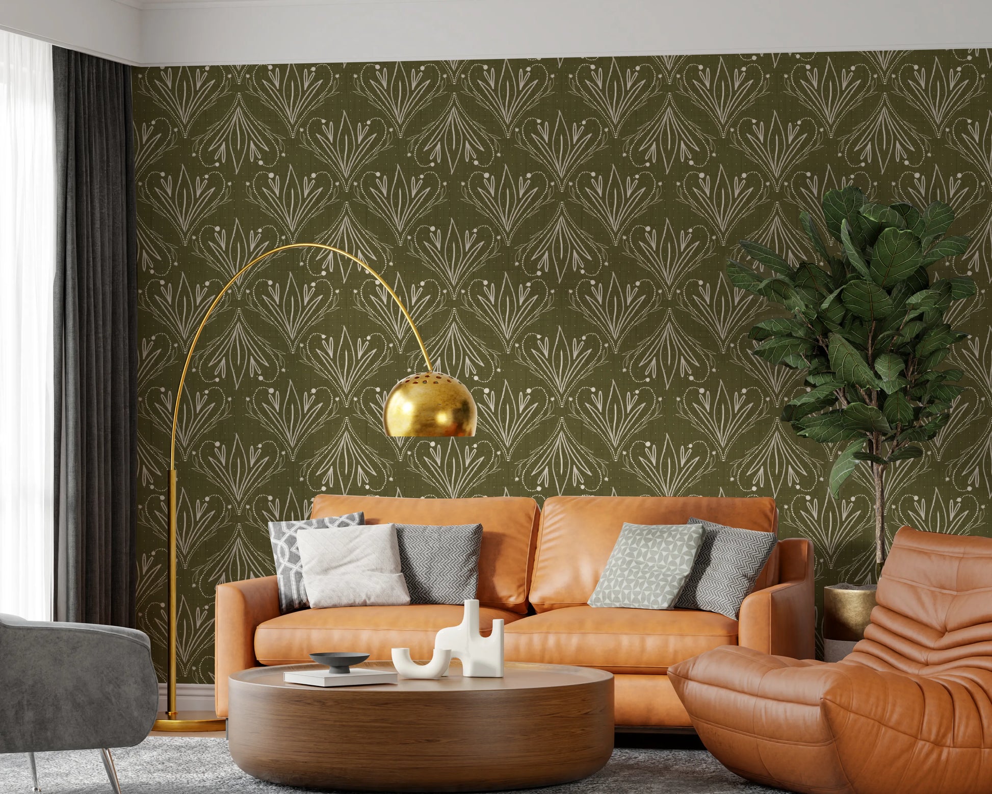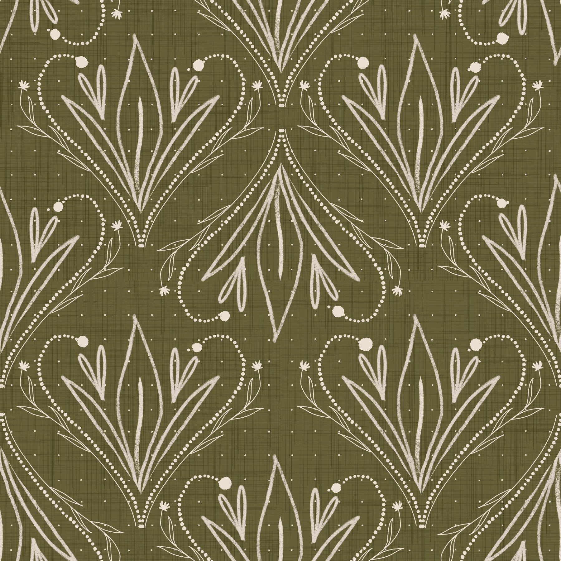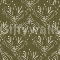 Boho Art Nouveau Folk Floral Olive Green Wallpaper – Hand Drawn Wallpaper⁠