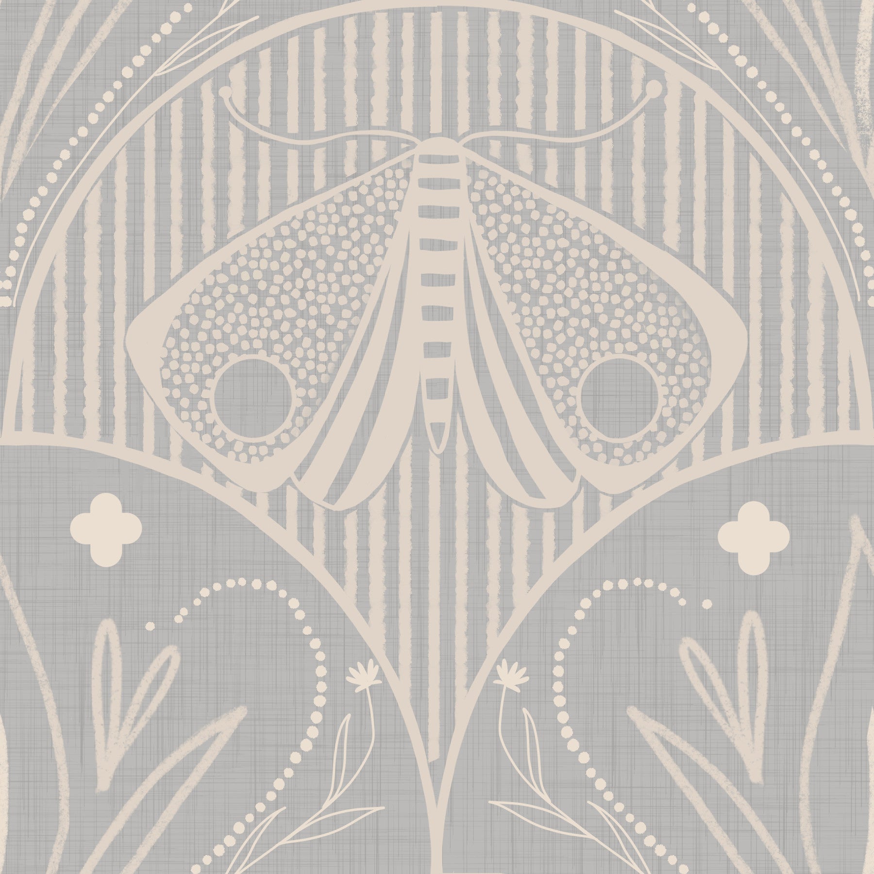 Light grey bohemian scallop butterfly wall paper fabric effect.
