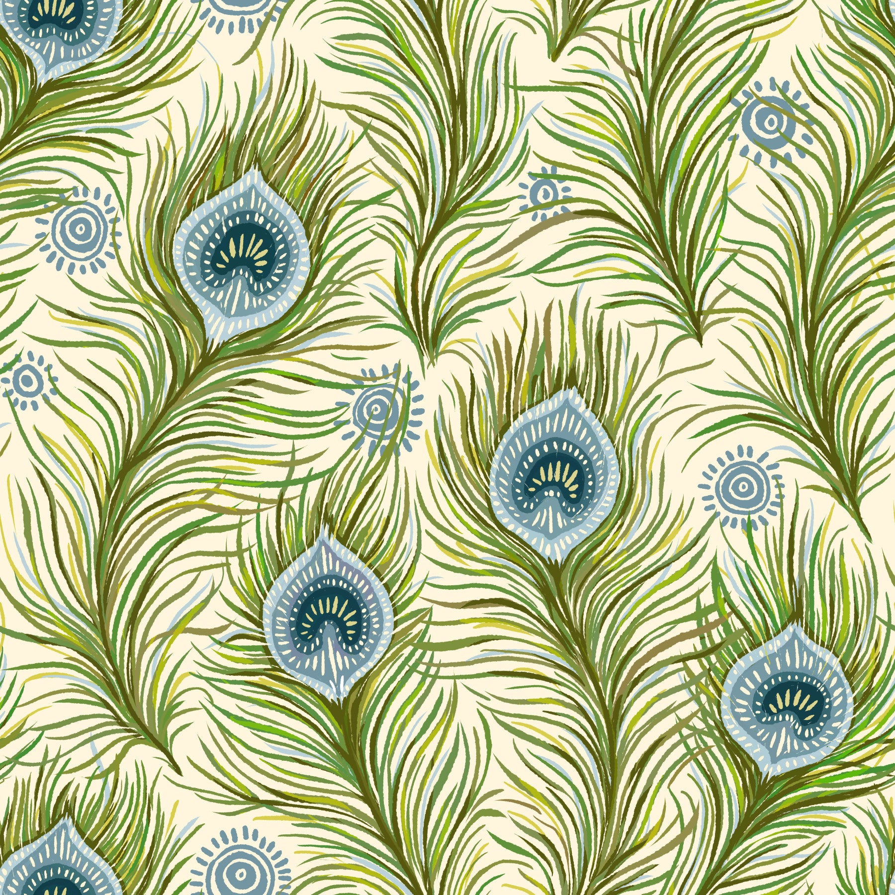 Embrace bohemian elegance with this captivating wallpaper featuring a stylized peacock feather pattern. Rich shades of blue and green create a serene yet vibrant atmosphere, enhanced by a creamy off-white background. The artistic rendering of the feathers, with their meticulously detailed barbs and eye-catching ocelli, adds a touch of whimsical sophistication. Simple, hand-drawn circular motifs subtly scattered throughout complete the boho chic aesthetic. This wallpaper offers a tranquil escape, perfect for adding a touch of exotic charm to any space.