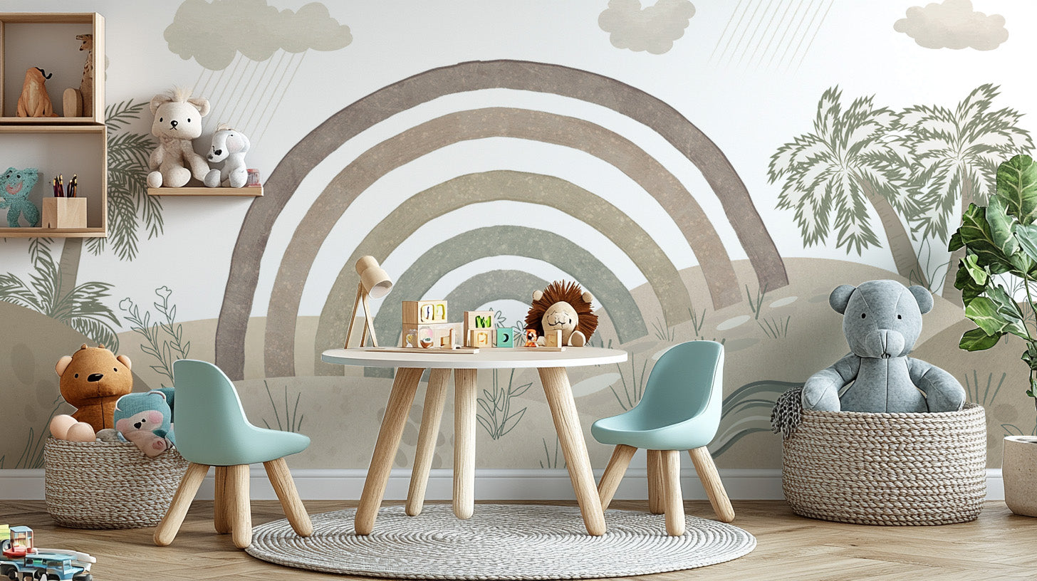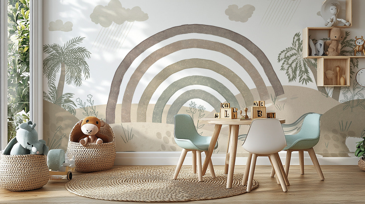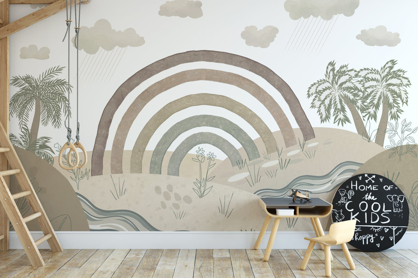 The Boho Earthy Rainbow Landscape Mural brings warmth with its muted tones and minimalist design. The neutral aesthetic mural blends soft beige, sage, and brown hues, creating a peaceful atmosphere. Inspired by nature, the watercolor rainbow landscape features gentle arches, flowing rivers, and delicate botanical elements. The minimalist nature-inspired wallpaper complements modern, bohemian, and Scandinavian interiors effortlessly. The organic textures and hand-drawn details add depth, making this desert boho mural perfect for bedrooms, nurseries, and living spaces. The soft color palette landscape mural enhances walls with a subtle, calming appeal, offering a timeless look.