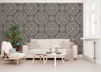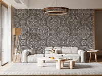Embrace the unexpected with 'Boho Fireworks Grunge Dark Bark,' a wall covering that marries rustic charm with a touch of bohemian whimsy. This design evokes the feeling of a muted celebration against a backdrop reminiscent of aged bark. The intricate pattern of scattered circles, suggestive of bursting fireworks, creates a captivating visual texture. The overall effect is an intriguing blend of raw, organic elements and celebratory patterns. The muted tones and weathered appearance offer a grounded yet artistic presence, perfect for adding character and depth to any space. Invite the spirit of creative expression into your home with this unique and captivating wall décor.