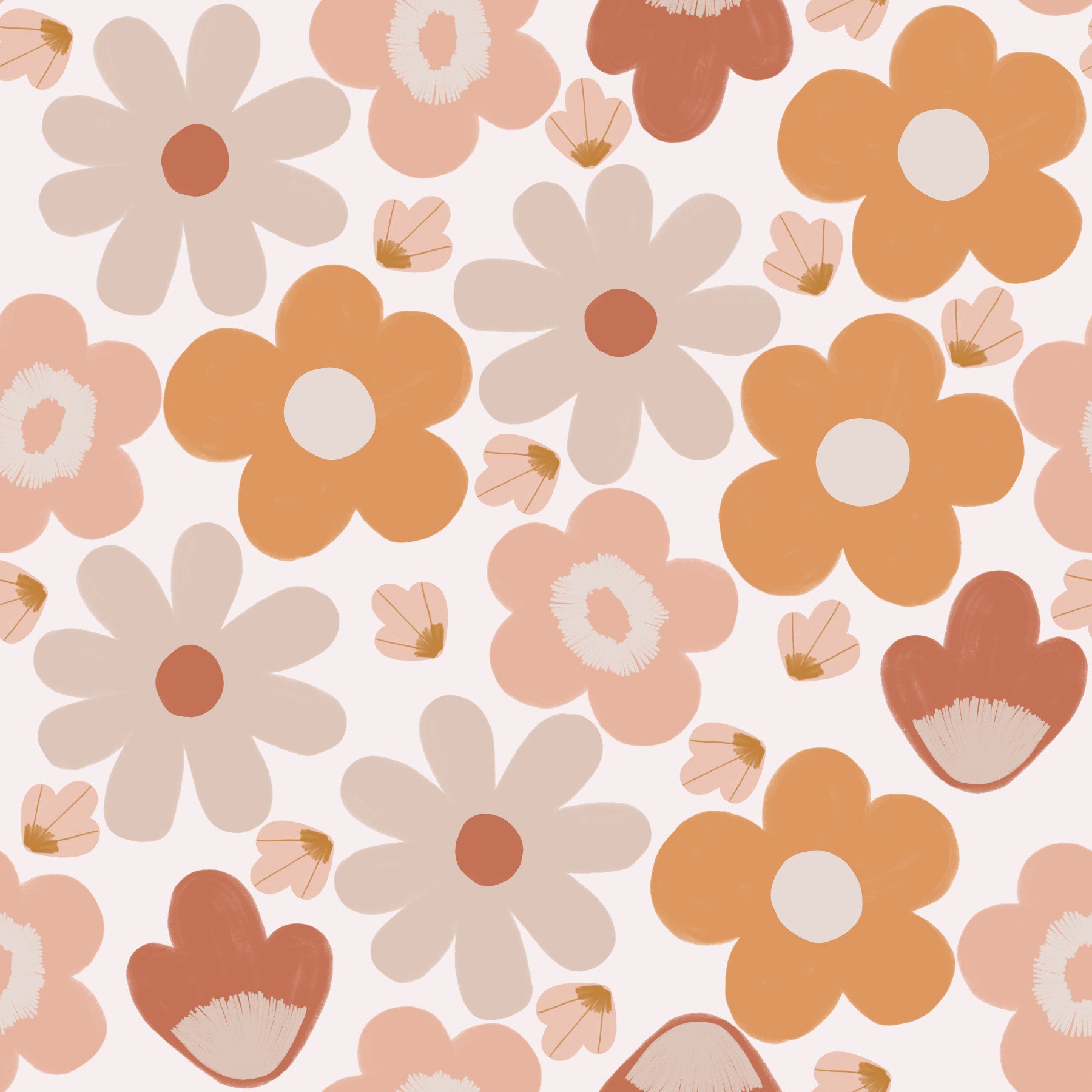 Retro-inspired boho wallpaper decorated with overlapping daisy-style flowers in muted warm colors.