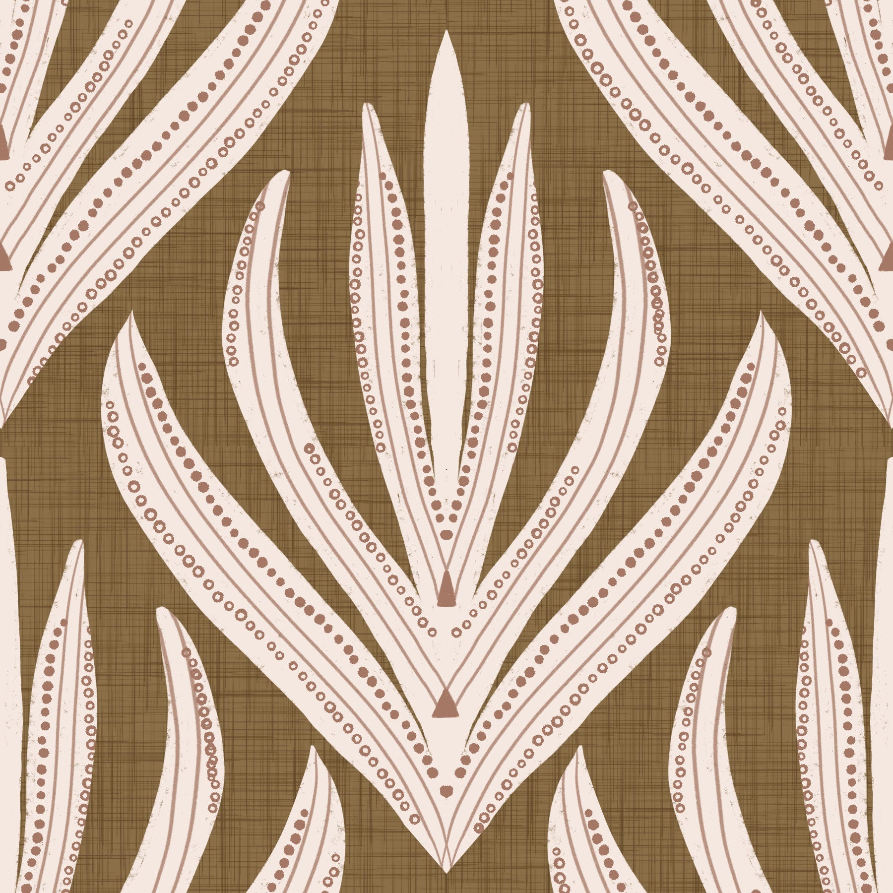 Patterned wallpaper featuring symmetrical boho leaves arranged in a vertical repeating formation.