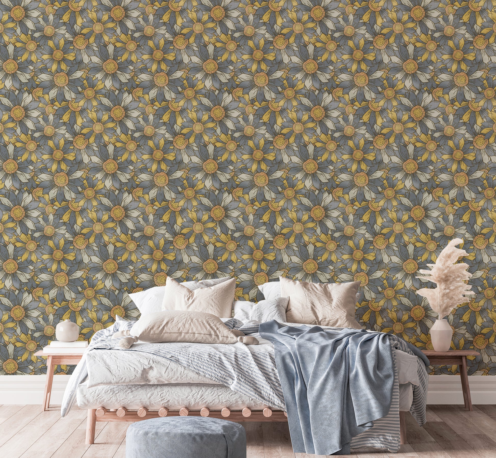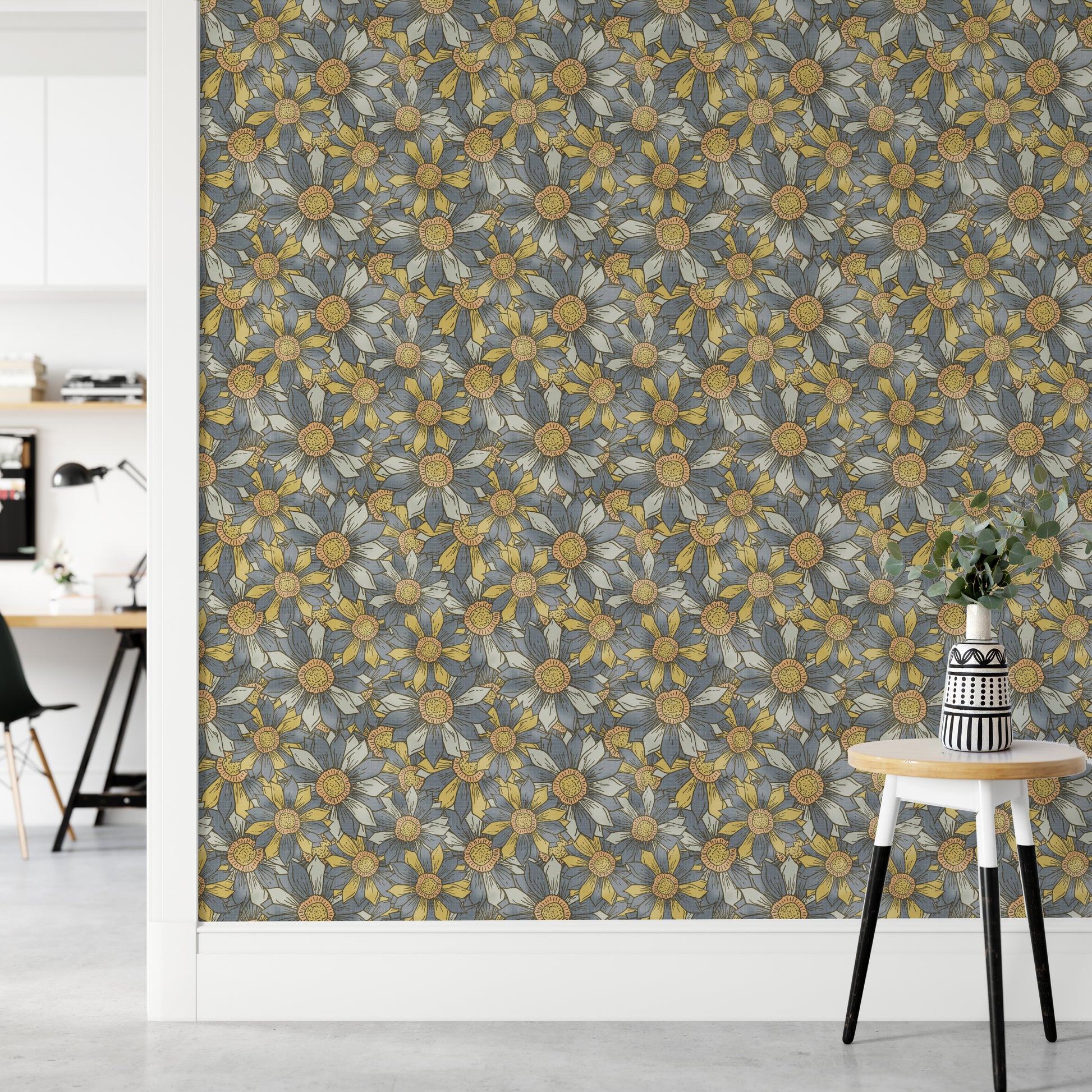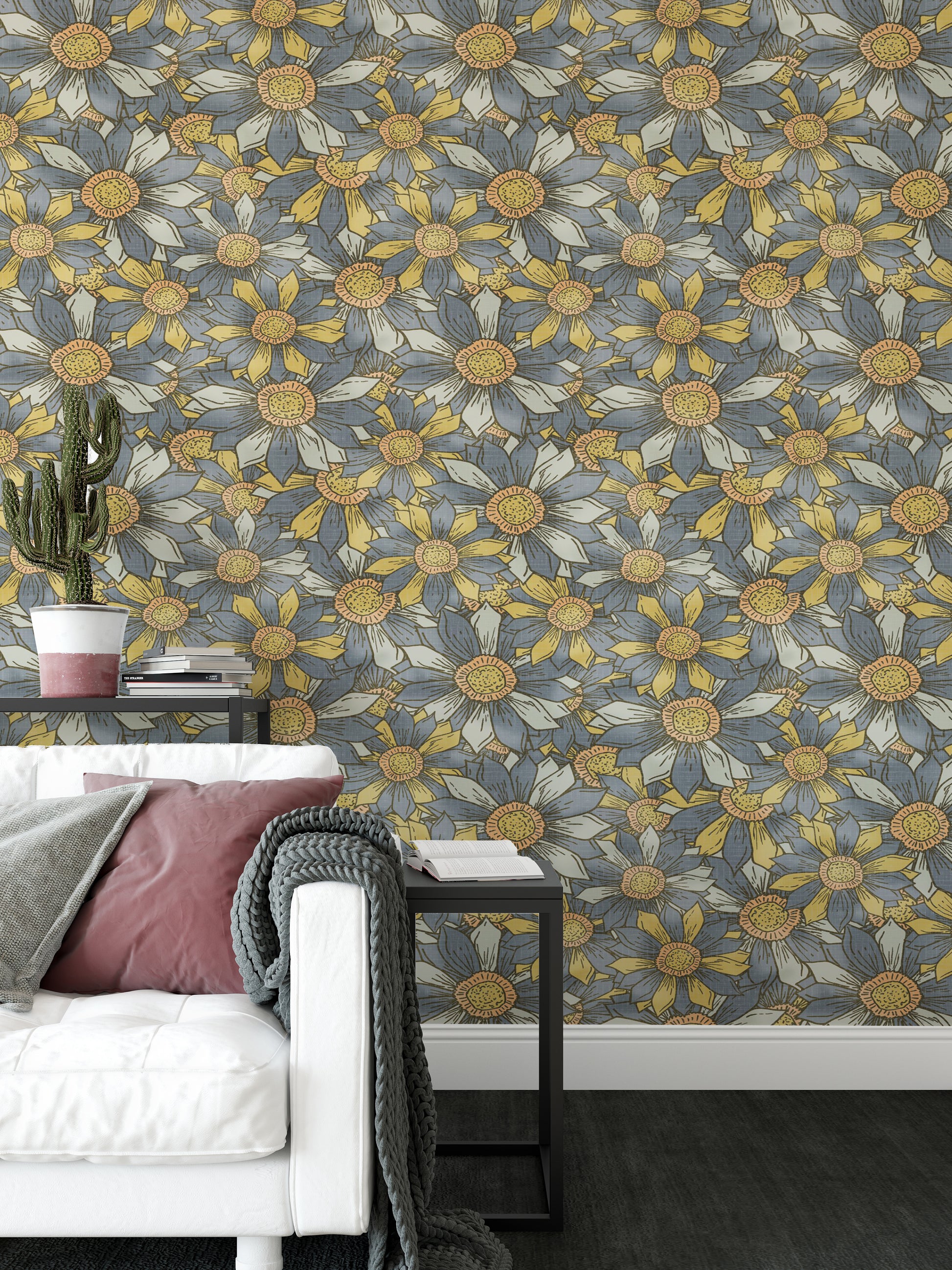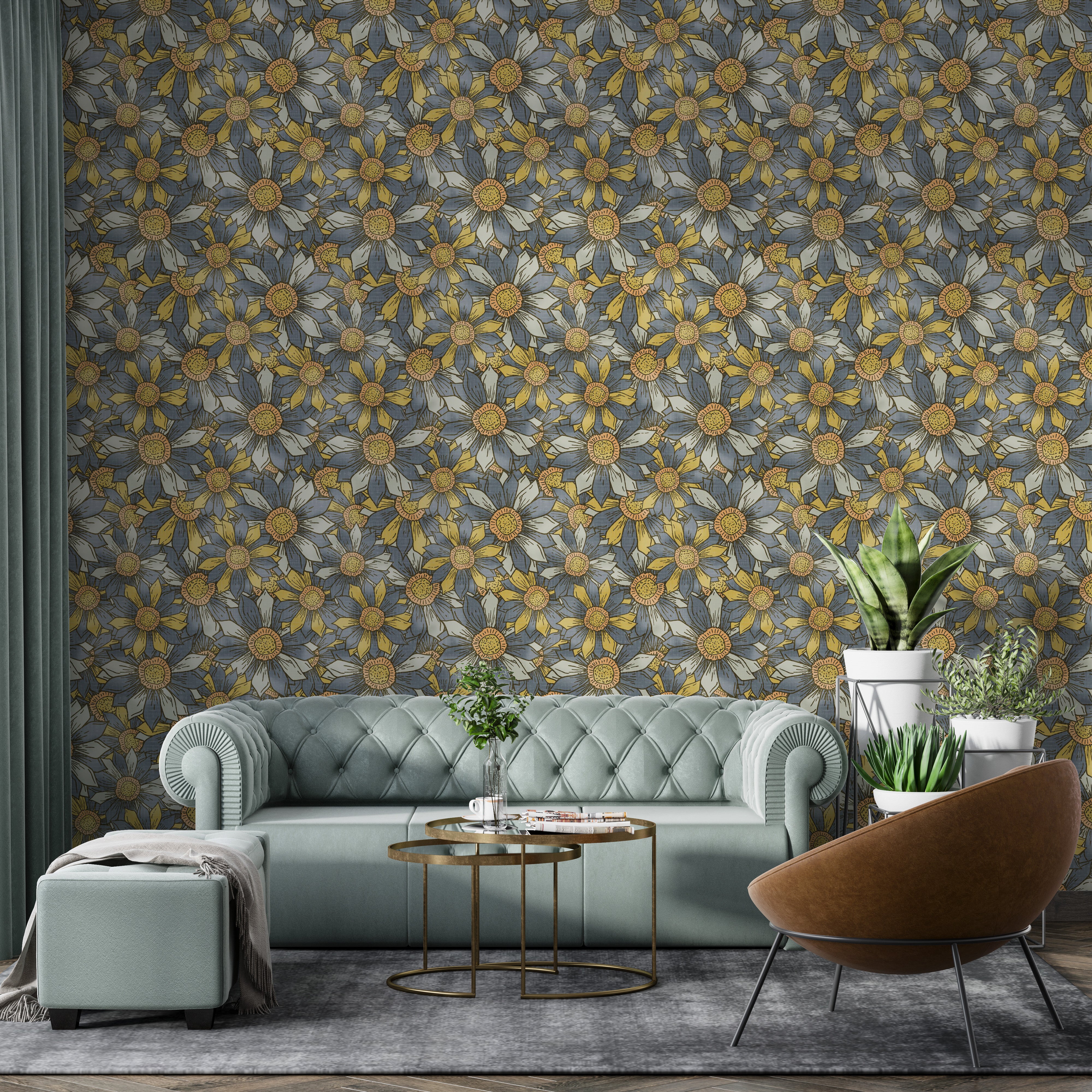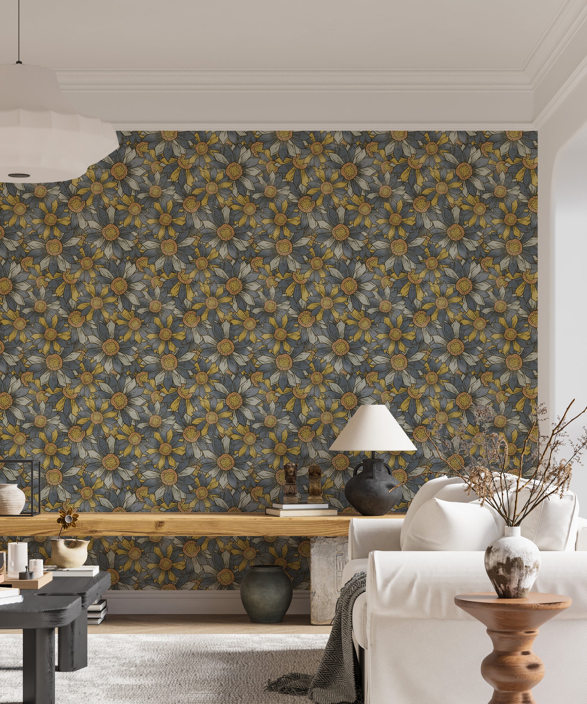 Bursting with bold energy, the Boho Maximalist Flowers Golden and Gray wallpaper brings personality to your walls. Oversized florals in mustard yellow, off-white, and slate gray create a vibrant, artistic statement. Perfect for feature walls, creative studios, or eclectic bedrooms, this wallpaper celebrates individuality and style. The hand-illustrated look and high-contrast palette make it a boho-chic dream for maximalist lovers. Removable and renter-friendly