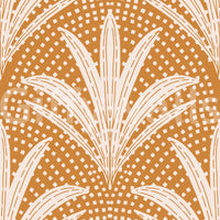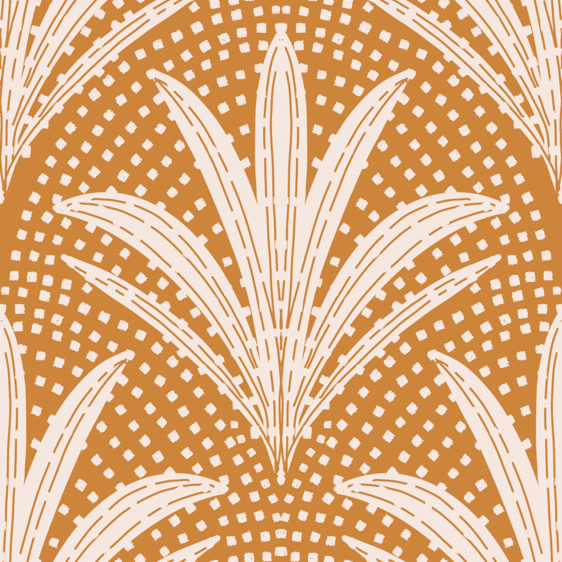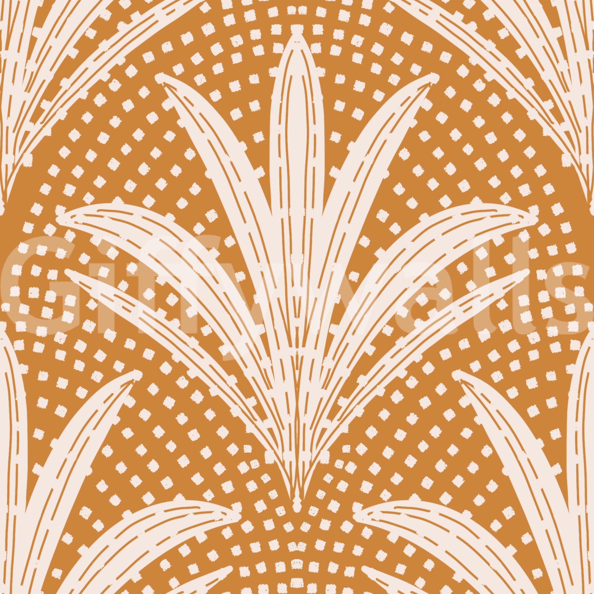 Embrace the warm, earthy tones of this Boho Rustic Palm Radiance Caramel Brown wallpaper. Stylized palm fronds in soft off-white gracefully radiate outwards against a rich caramel brown backdrop, punctuated by a subtle textured dot pattern. The design evokes a sense of relaxed sophistication, blending bohemian aesthetics with rustic charm. Perfect for creating a tranquil and inviting atmosphere in any space, this wallpaper offers a unique and visually appealing blend of organic forms and geometric details, making it an ideal choice for those seeking a touch of modern warmth in their home decor.