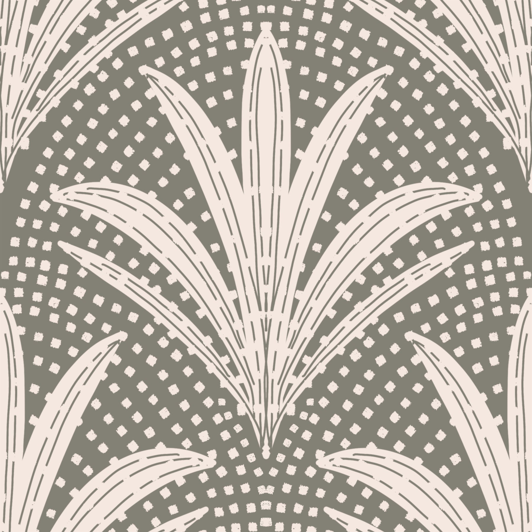Embrace serene sophistication with this Boho Rustic Palm Radiance Muted Grey wallpaper. The design features stylized palm fronds in a soft, off-white hue, radiating outwards against a calming muted grey backdrop. A subtle textured dot pattern adds depth and a touch of rustic charm, enhancing the overall bohemian feel. This wallpaper perfectly blends natural elements with a modern minimalist aesthetic, creating a tranquil and stylish atmosphere for any space. The muted color palette promotes relaxation and is ideal for bedrooms, living rooms, or home offices seeking a peaceful and sophisticated ambiance.
