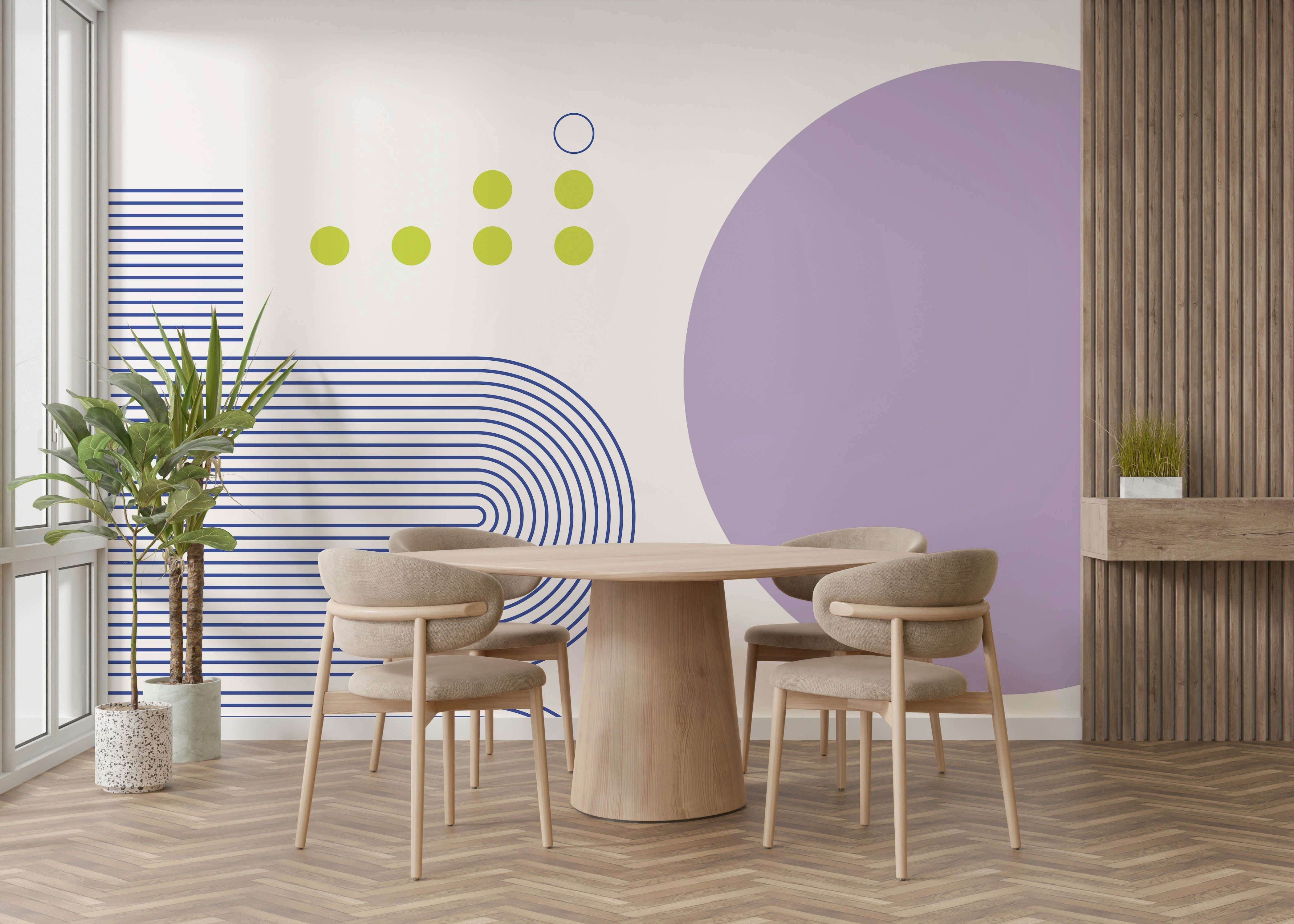 Experience the minimalist elegance of "Bold Bauhaus Geometry." This wallpaper showcases a striking composition of concentric blue arcs, juxtaposed against a soft lilac circle and vibrant lime green accents. The precise lines and carefully placed shapes echo the clean aesthetic of Bauhaus design, creating a visually captivating and balanced piece. Perfect for modern and minimalist interiors, this wallpaper brings a touch of sophisticated geometric art to any space. The interplay of curved and circular forms offers a dynamic yet calming effect, fostering a sense of order and artistic serenity.
