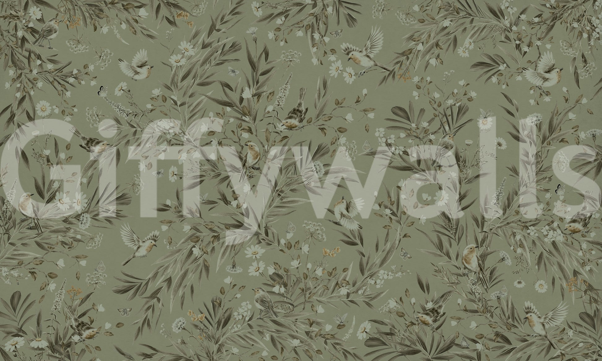 Romantic wall mural depicting birds and plants in a harmonious natural scene
