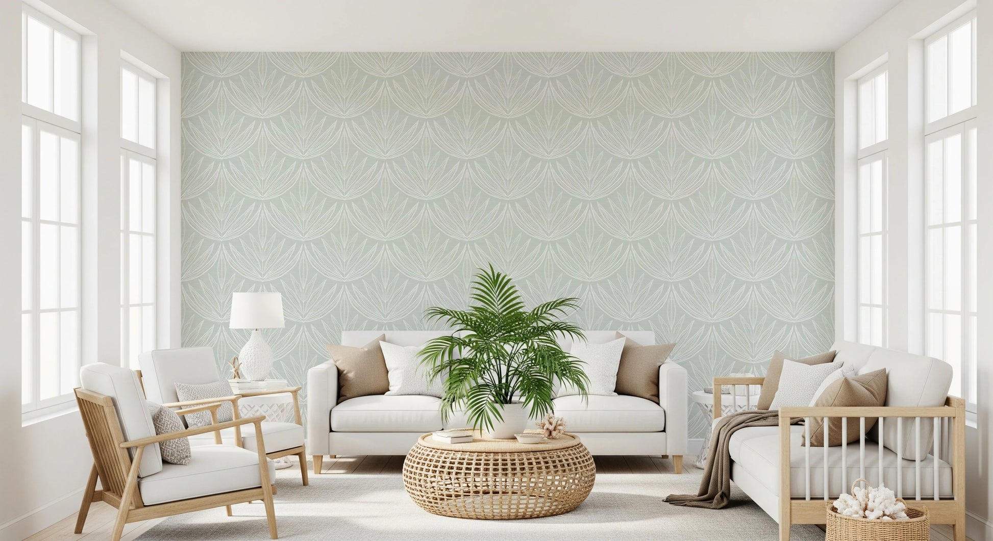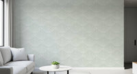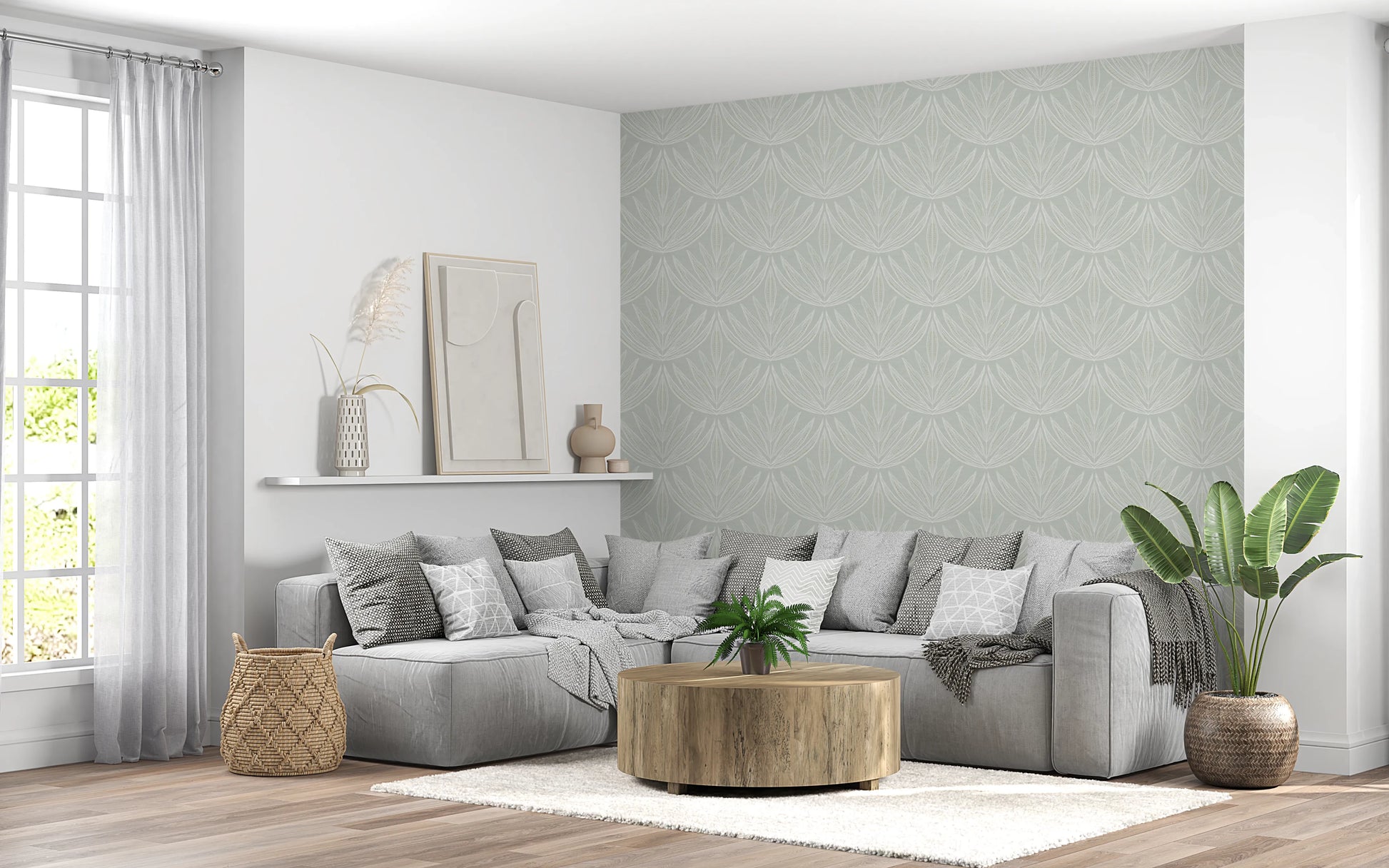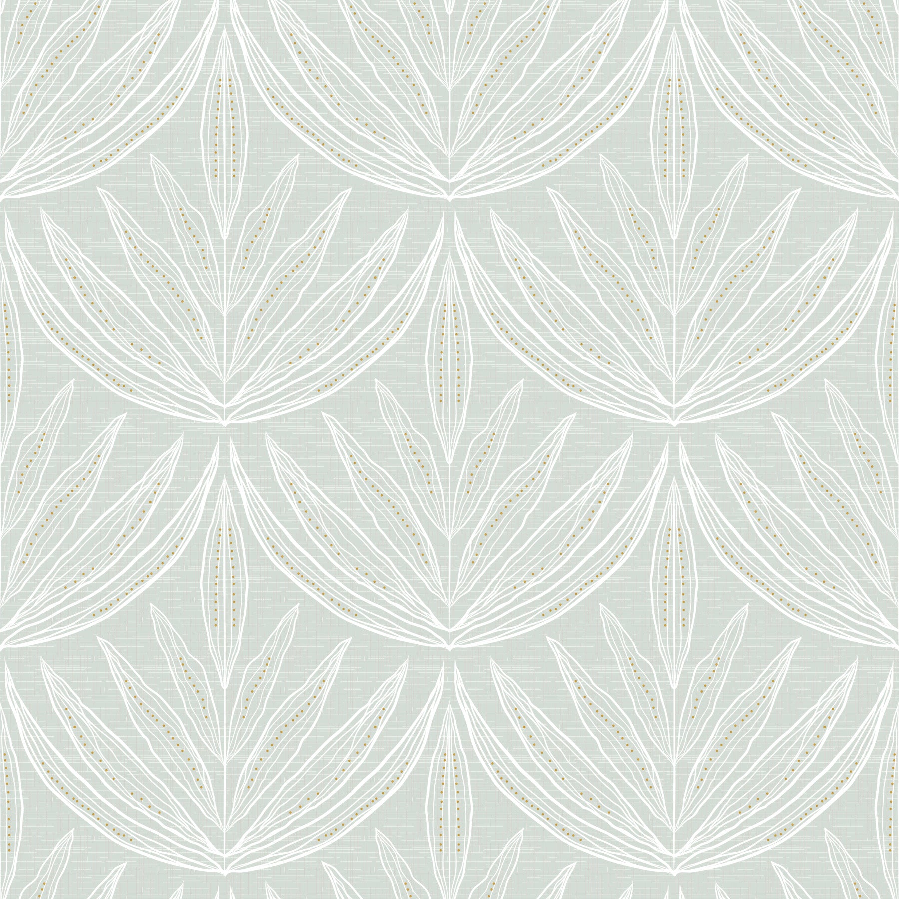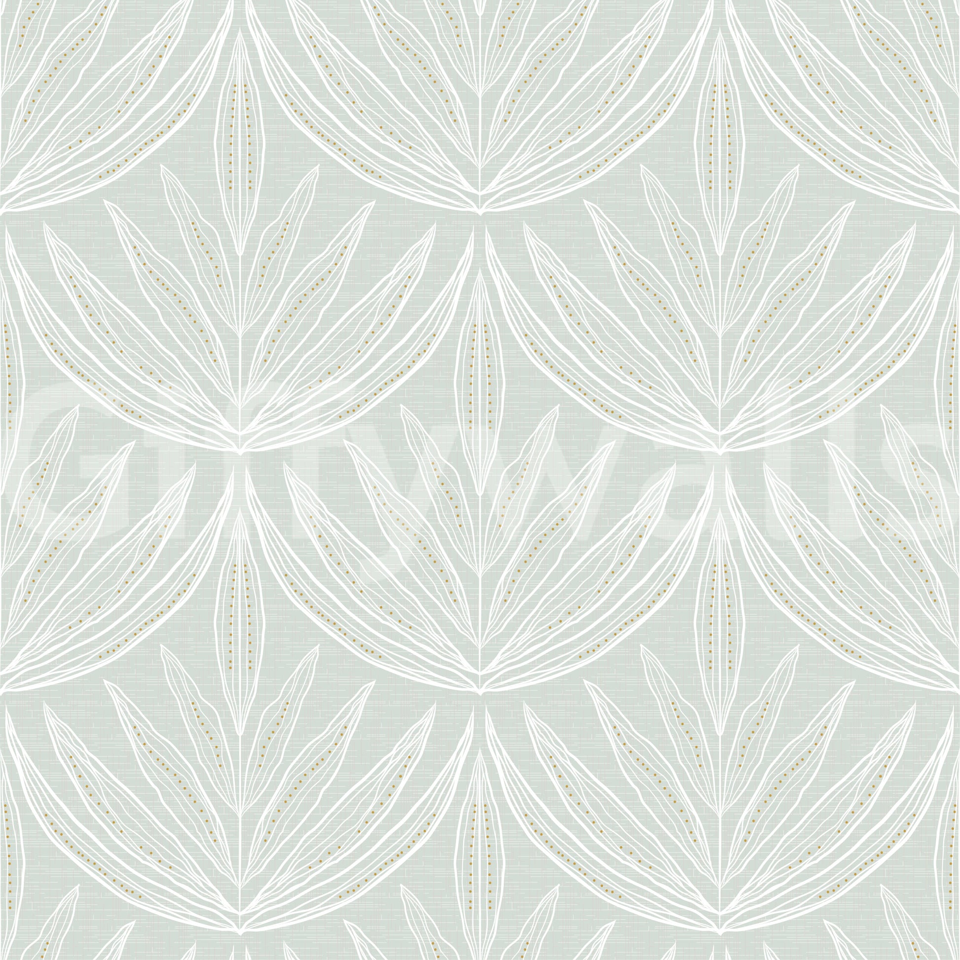 Invite a serene atmosphere into your home with this botanical-inspired wallpaper for walls. The design features stylised palm fronds rendered in a delicate white linework against a soft sage-green background. Subtle gold dots add a touch of warmth and sophistication. This elegant design enhances living rooms, bedrooms, and entryways, creating a tranquil and inviting space. The clean lines and muted palette complement both modern and classic decor styles, providing a versatile backdrop that brings a sense of calm and organic beauty to any interior. Its seamless pattern makes installation straightforward, ensuring a flawless finish on every wall.