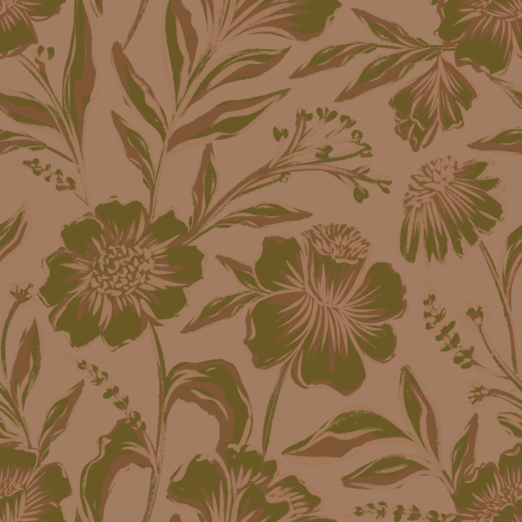 Bring the outdoors in with this botanical wallpaper. Dark flowers and delicate leaves create depth and warmth. The earthy brown and muted green tones establish a peaceful ambience. The design shows clear strokes, which create a handmade feel. Enhance bedrooms, living rooms, or hallways with this classic wallpaper for walls. Its neutral palette easily matches different furniture and decor. Enjoy a natural touch that creates a calming home environment.