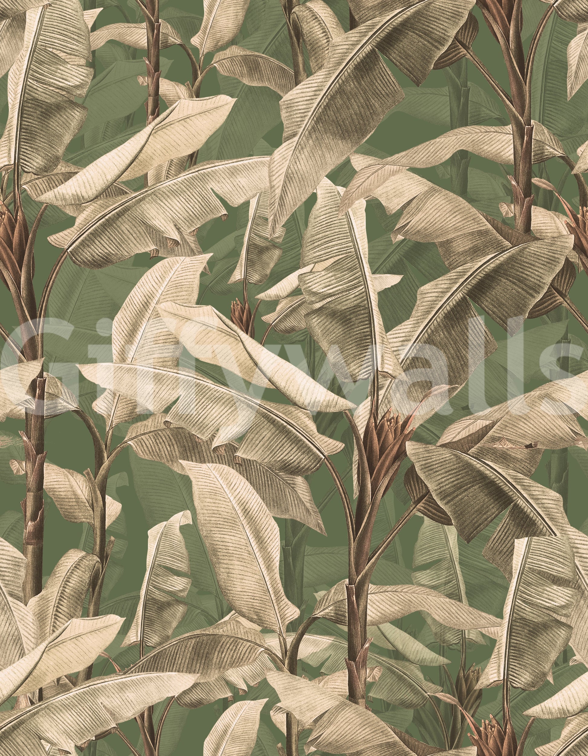 Immerse yourself in the beauty of nature with this captivating botanical wallpaper. Featuring a dense arrangement of banana leaves, rendered in exquisite detail, this design transports you to a lush, tropical paradise. The muted beige and green color palette evokes a sense of calm and sophistication, making it perfect for creating a tranquil atmosphere in any room. The seamless pattern ensures a cohesive and visually appealing effect, while the hand-drawn style lends a touch of vintage charm. Ideal for adding a touch of elegance and natural beauty to your home, this wallpaper is a stunning statement piece that blends seamlessly into various interior designs.