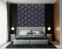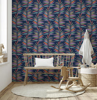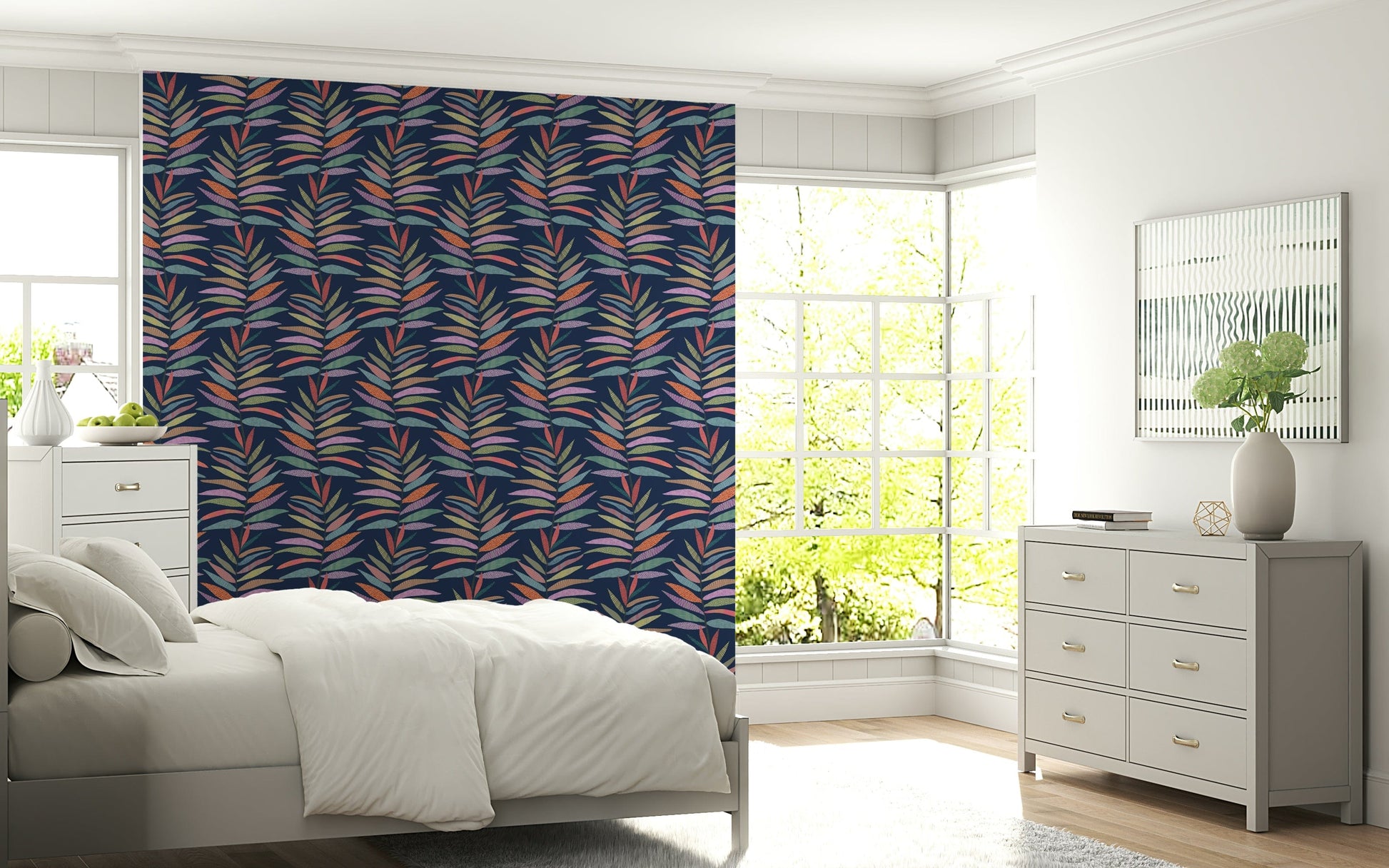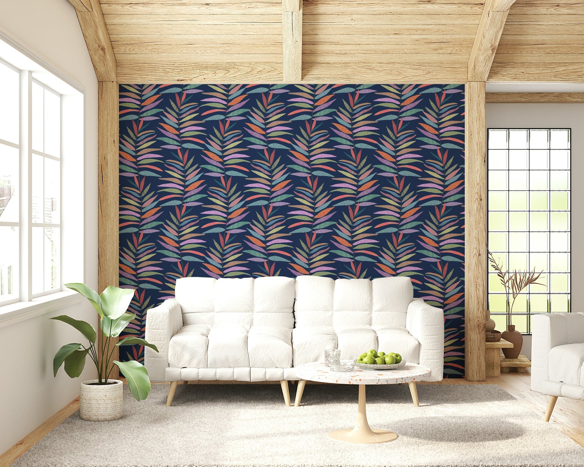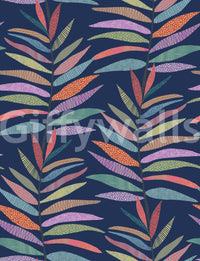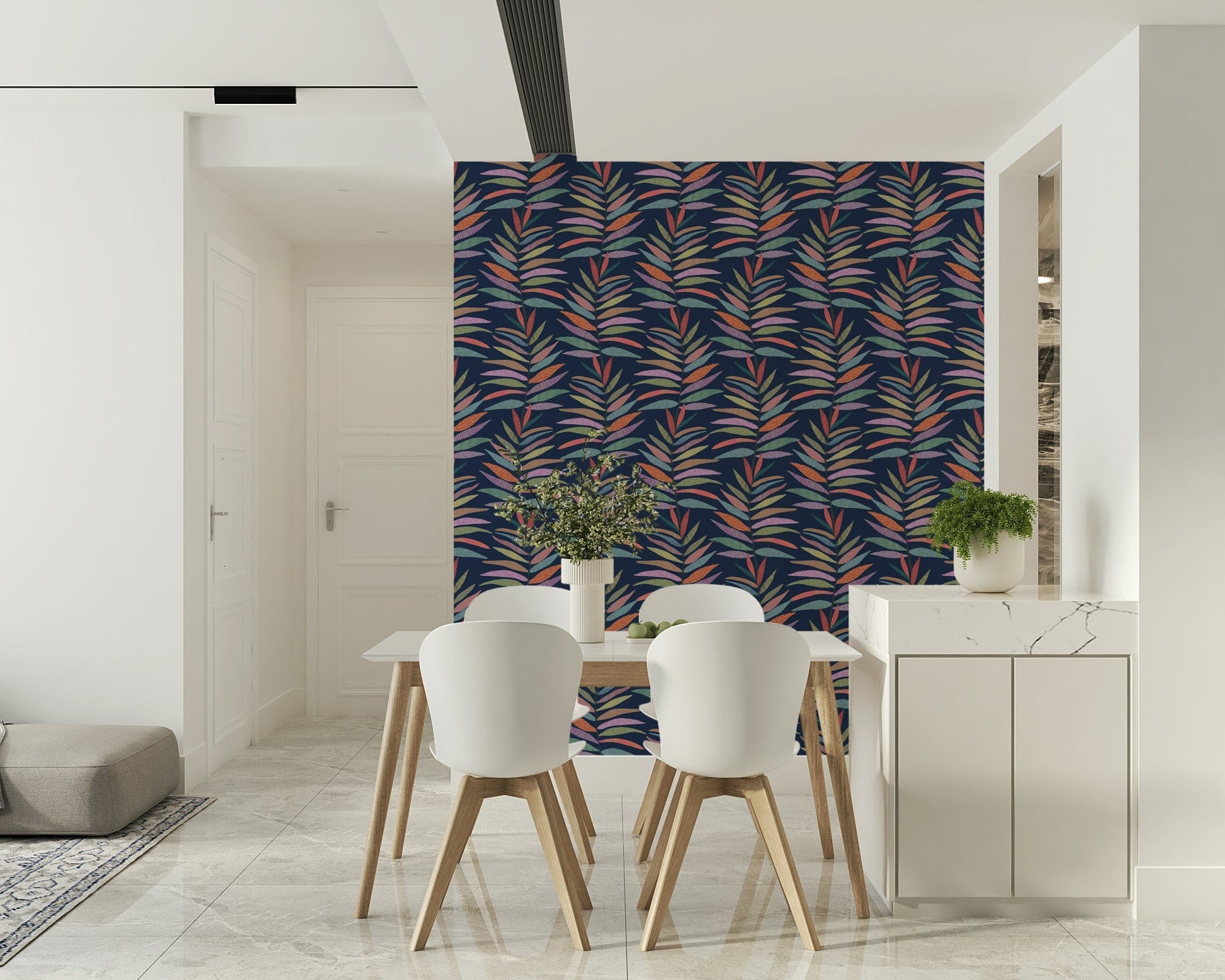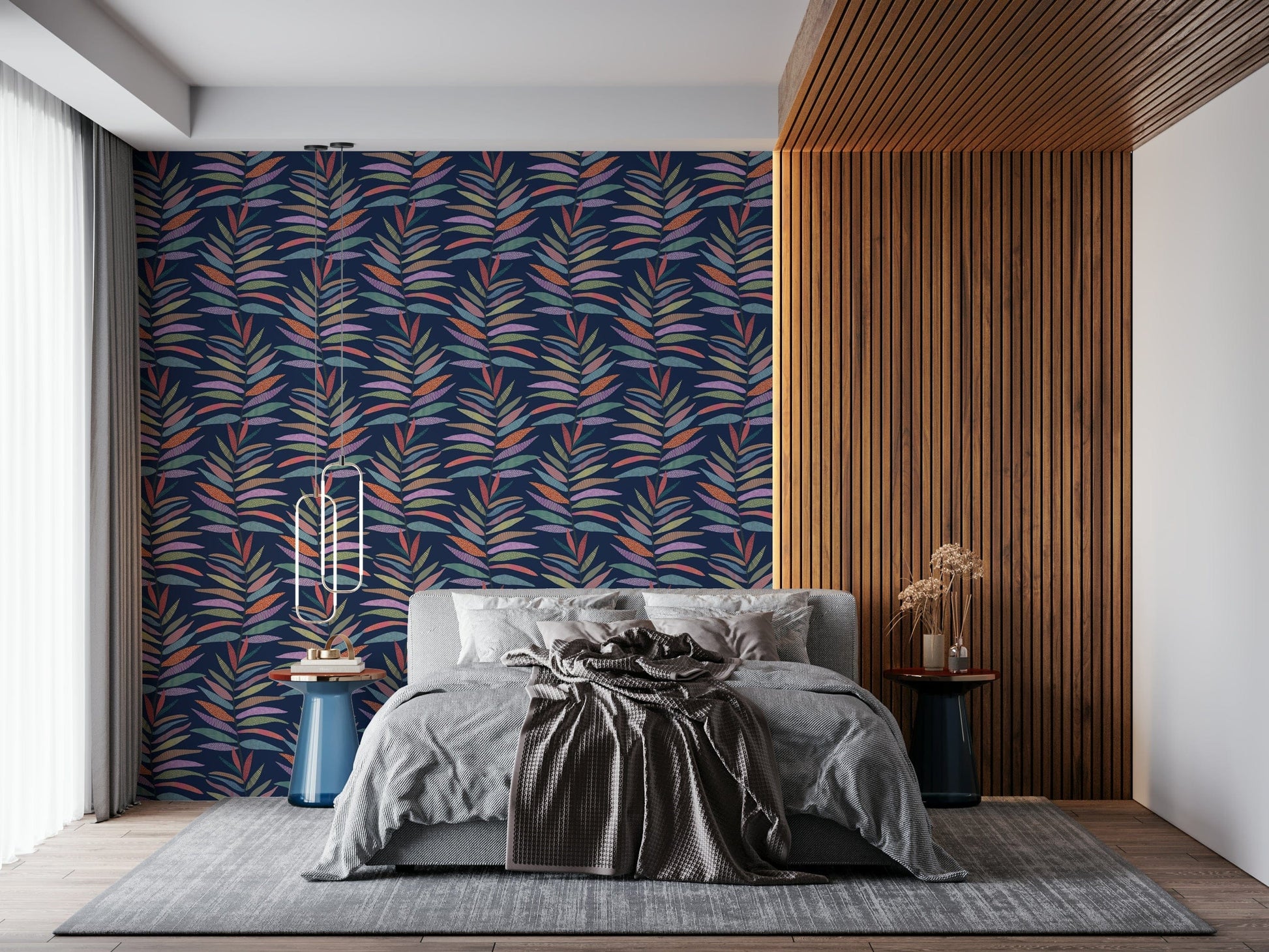 Adorn your walls with the vibrant, textured charm of this patterned wallpaper for walls. A deep navy base allows the whimsical, multi-coloured leaves to become the focal point. Each leaf showcases a different pattern, including stripes, dots, and zigzags, offering a playful twist. This design complements both modern and retro aesthetics. Ideal for living rooms, bedrooms or hallways, this wallpaper brings an artistic touch to your space. The seamless design creates an immersive effect and enhances any interior with its joyful, botanical charm.