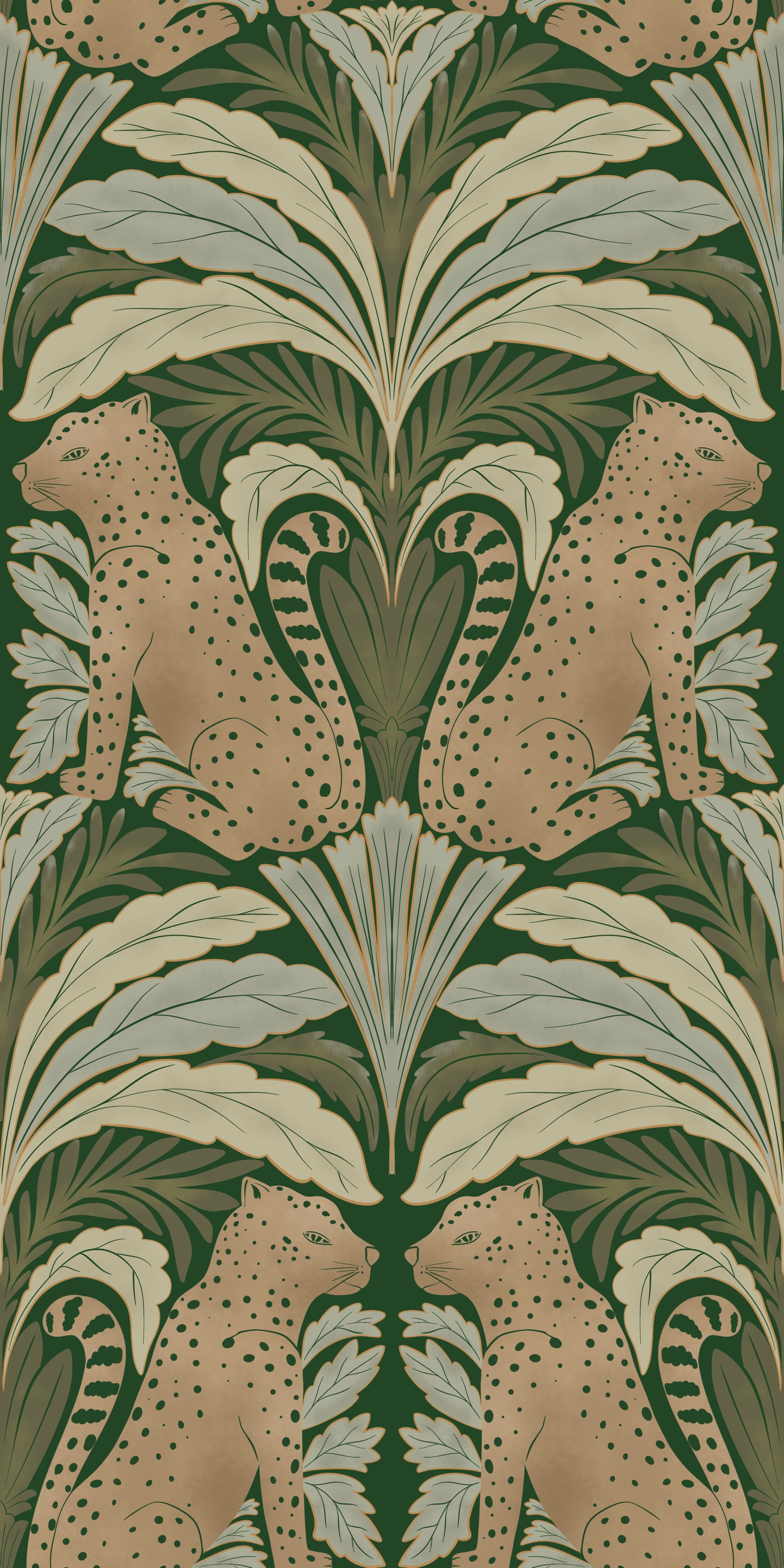 This wallpaper features a symmetrical arrangement of leopards amidst stylized leaves, rendered in a palette of green, beige, and brown. The repeating pattern of the design creates a sense of calm and order. The artwork has a botanical feel and showcases the repeating symmetry. The leopards and botanical elements combine to give a unique and striking visual.