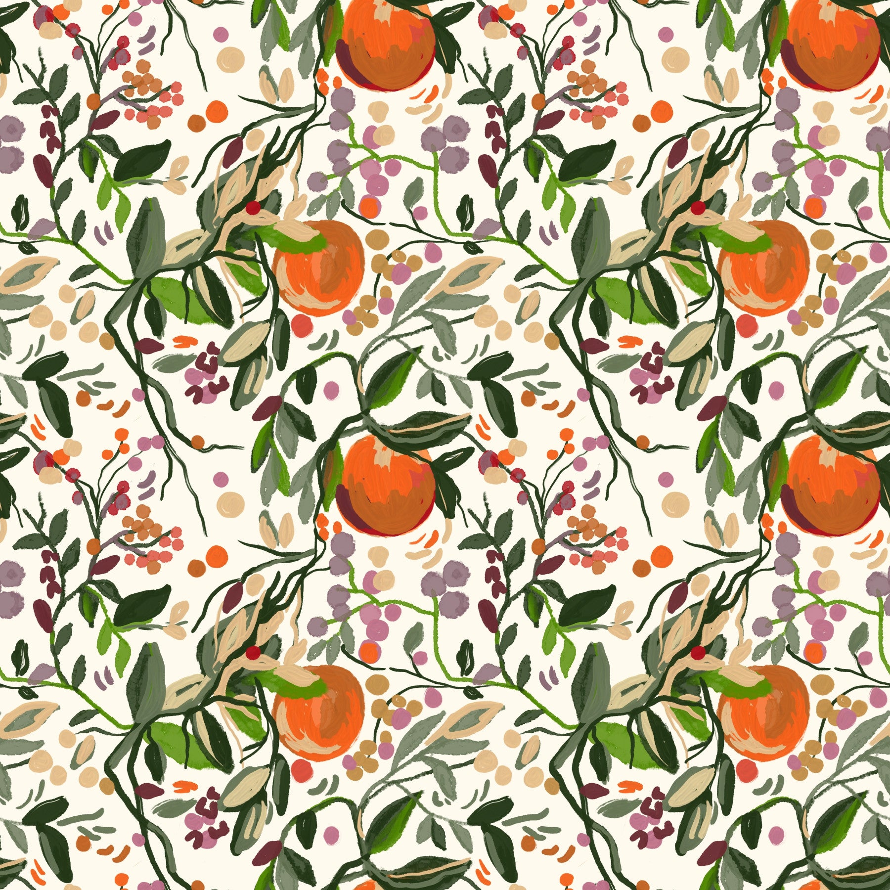 Infuse your home with the refreshing energy of citrus with this botanical-inspired design. It features painterly oranges, leaves, and berries on an off-white background. The seamless pattern offers a touch of nature to your home. This design adds an organic touch that complements any interior. Use this wallpaper for walls to create an inviting atmosphere in kitchens, dining areas, or sunrooms, adding a fresh, vibrant look.