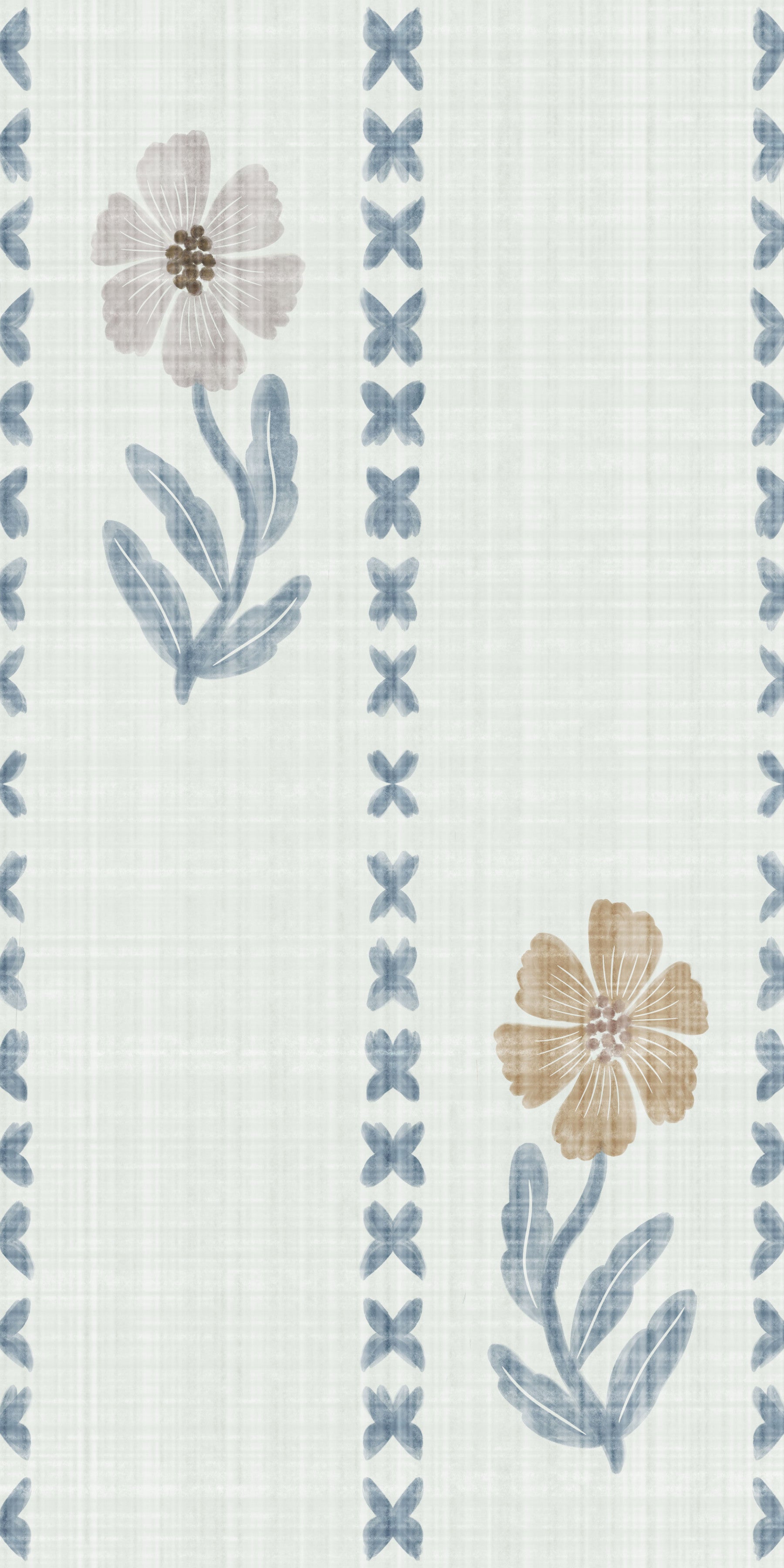 This wallpaper presents a sophisticated take on botanical patterns. Vertical stripes of subtly muted blush pink and taupe flowers, rendered in a watercolor style, create a sense of calm and order. These are beautifully complemented by vertical lines of watercolor butterflies in a soft blue-gray hue. The texture mimics a fine linen fabric, lending a touch of rustic sophistication to the overall design. Its muted color palette and understated elegance make it suitable for bedrooms, living areas, and any space where a touch of refined tranquility is desired. The pattern's seamless repeat ensures a cohesive and luxurious finish.