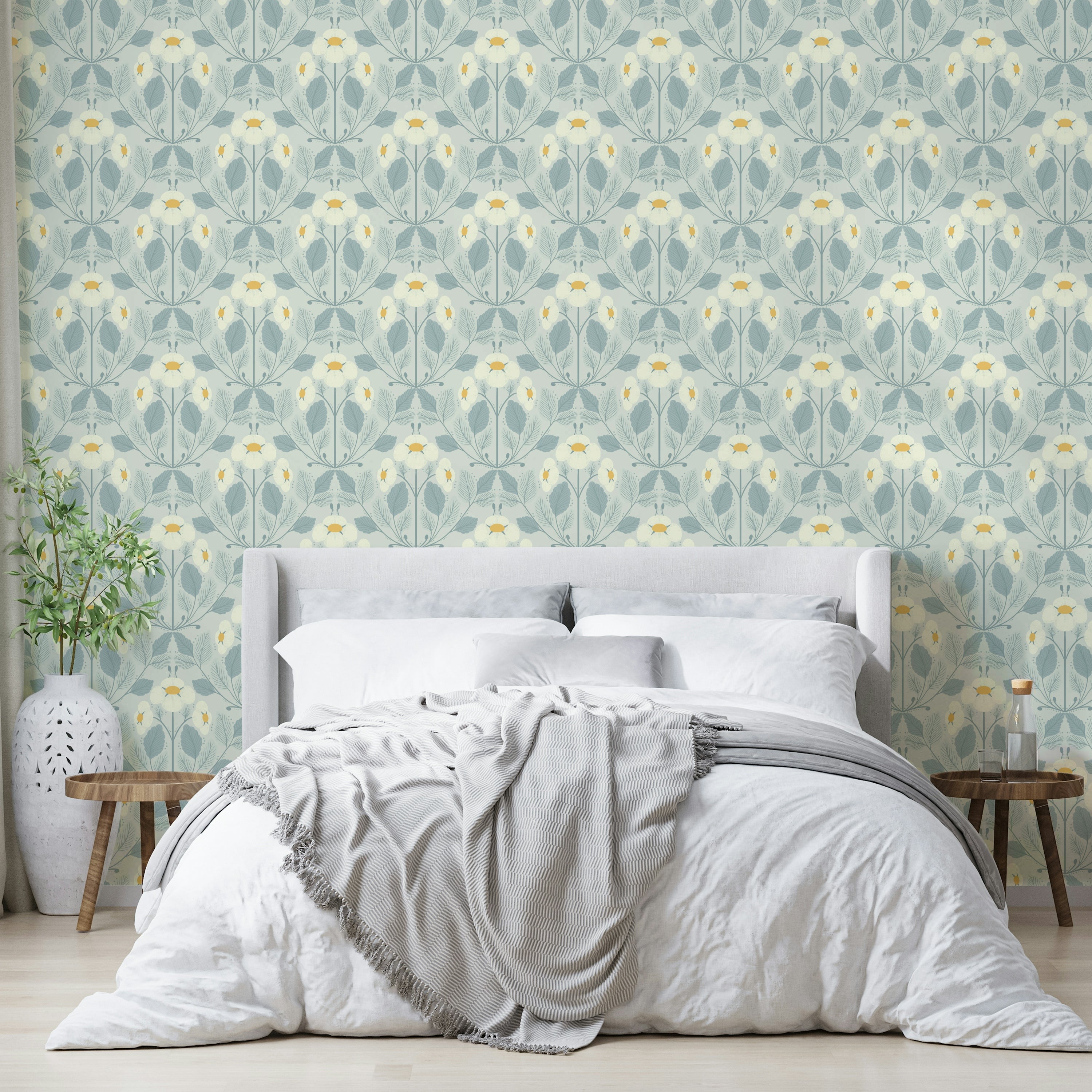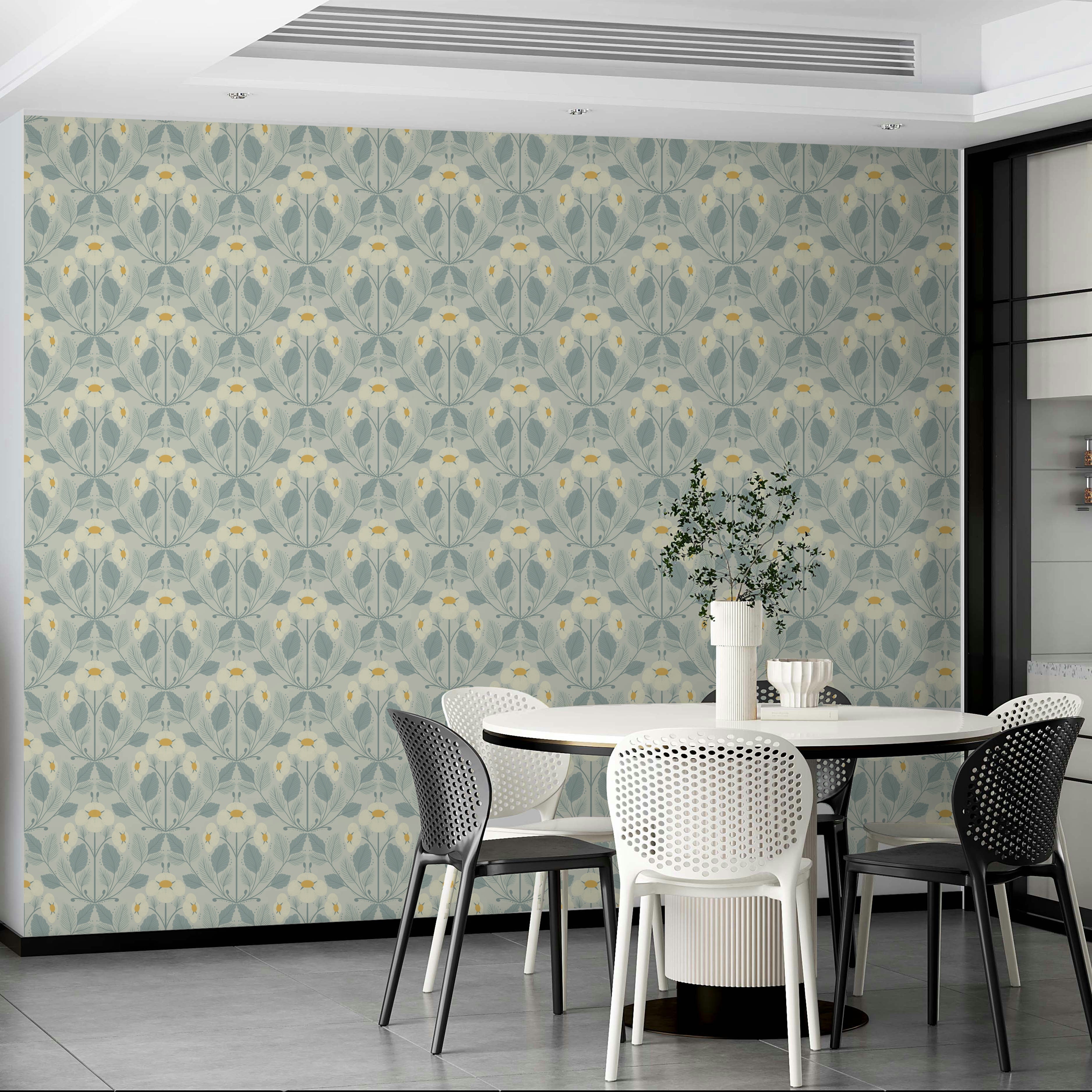 Bring a fresh, airy vibe to your interiors with Strawberry Folk – Mist Leaf wallpaper. This design blends creamy white florals, soft yellow centers, and pale green leaves on a light mist-toned background. The symmetrical folk-art pattern adds gentle rhythm, making it a great fit for kitchens, breakfast nooks, or craft rooms. Its soft tones and vintage-inspired layout offer a soothing yet playful feel that suits both modern and classic spaces. Ideal for anyone who enjoys botanical themes with a subtle folk touch, this wallpaper for walls adds charm without overwhelming the room’s natural light and texture.