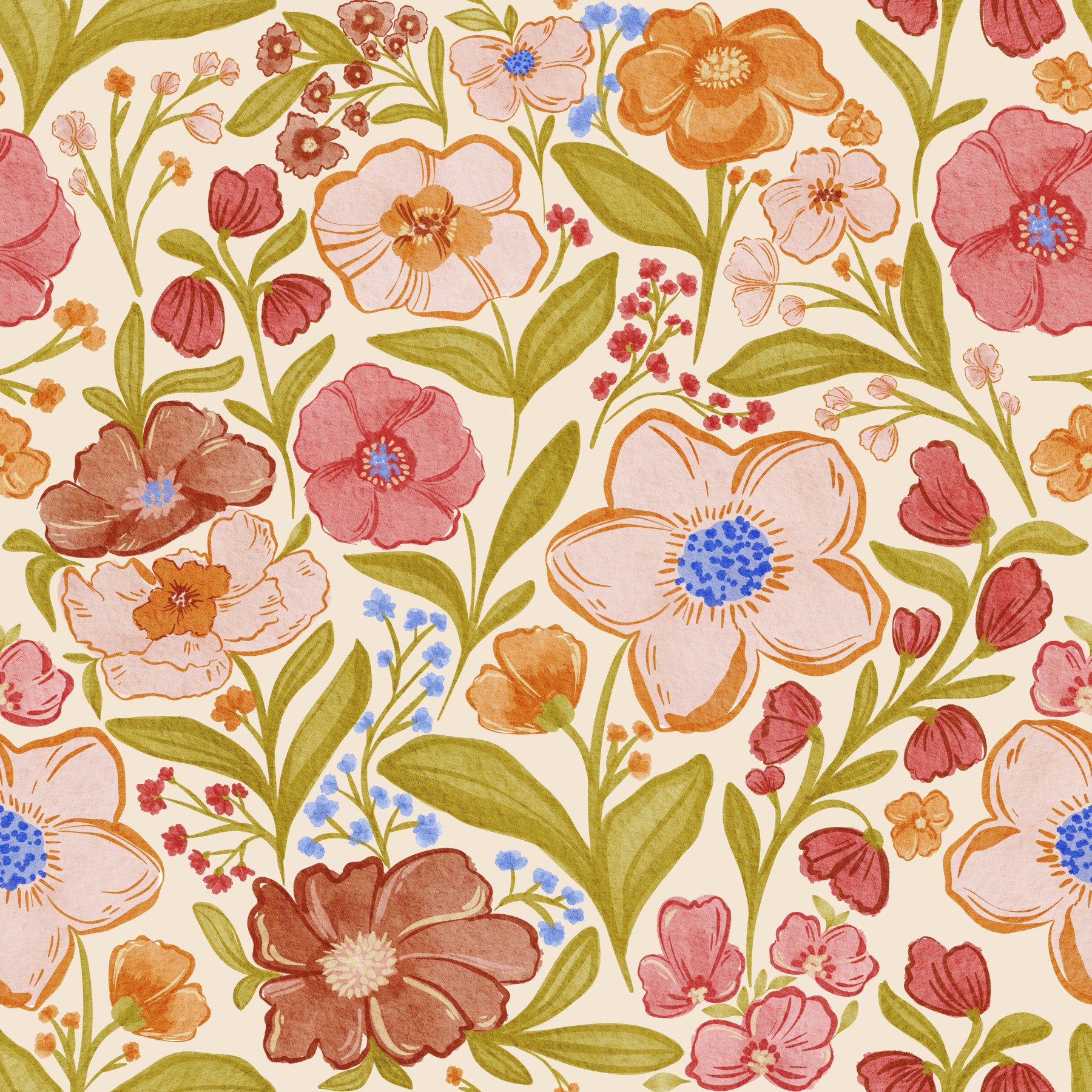 'Botanical Watercolor Dreams' transports you to a world of gentle beauty. This wallpaper features a captivating watercolor pattern of soft-hued blossoms and leaves, rendered with delicate brushstrokes against a warm, off-white canvas. The earthy color palette—embracing subtle pinks, oranges, and reds—creates a soothing and harmonious ambiance, perfect for bedrooms, living rooms, or any area where tranquility is desired. The painterly details lend a unique, artistic touch, while the seamless pattern guarantees a sophisticated, cohesive look across your walls. Let the gentle beauty of nature inspire your interior design.
