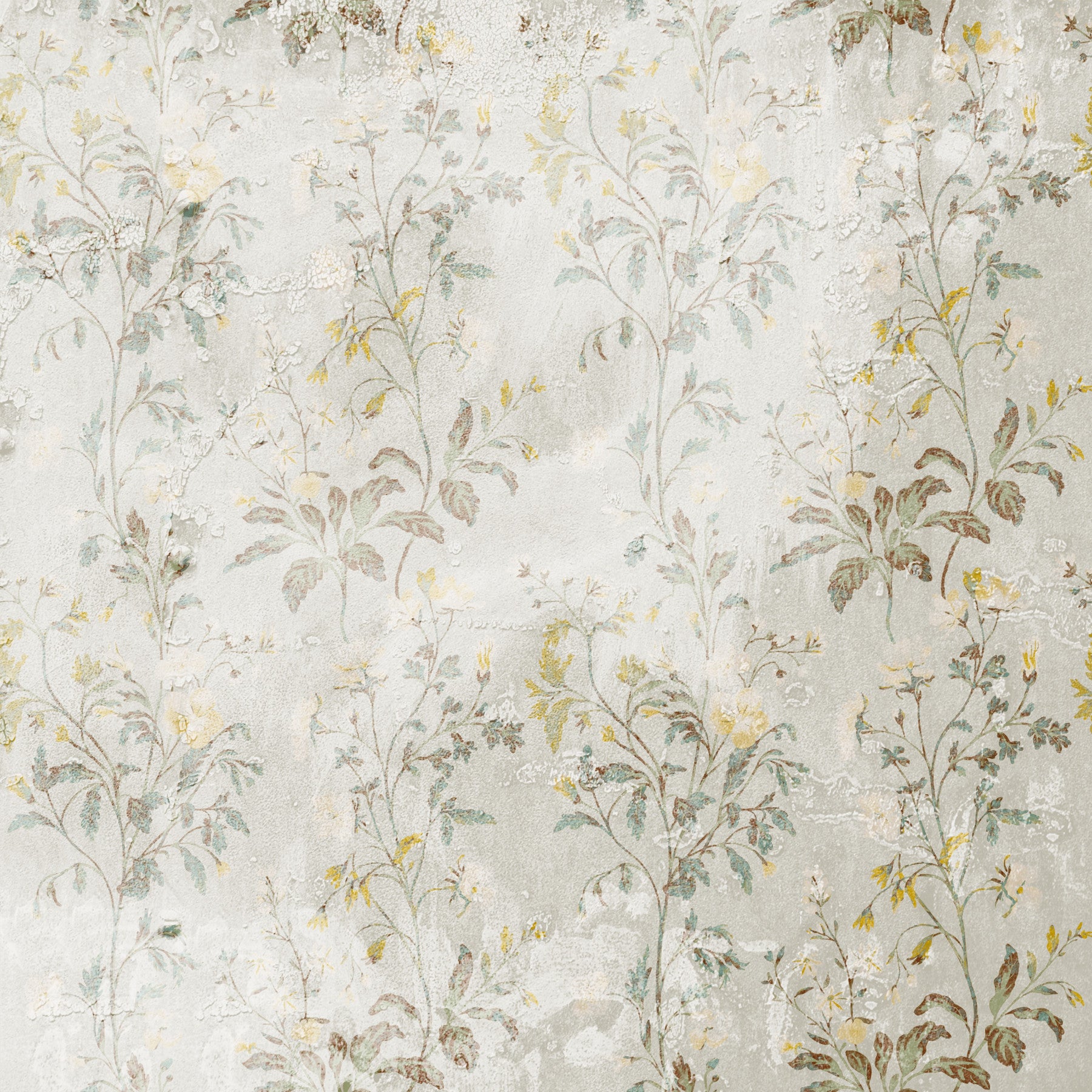 Immerse yourself in the subtle beauty of "Botanical Whispers," a wallpaper that evokes a sense of vintage charm and delicate serenity. Soft, muted tones of sage, ochre, and cream intertwine in a graceful dance of floral motifs, creating a visual tapestry that whispers of nature's quiet elegance. This design features slender stems adorned with dainty blossoms and intricately detailed leaves, all subtly textured against a gently distressed backdrop. The distressed elements add depth and character, lending the wallpaper an aged, almost antique feel. Perfect for creating a calming and sophisticated atmosphere, "Botanical Whispers" transforms any room into a tranquil sanctuary. Embrace the gentle allure of this design and let its botanical artistry whisper peace into your living space.