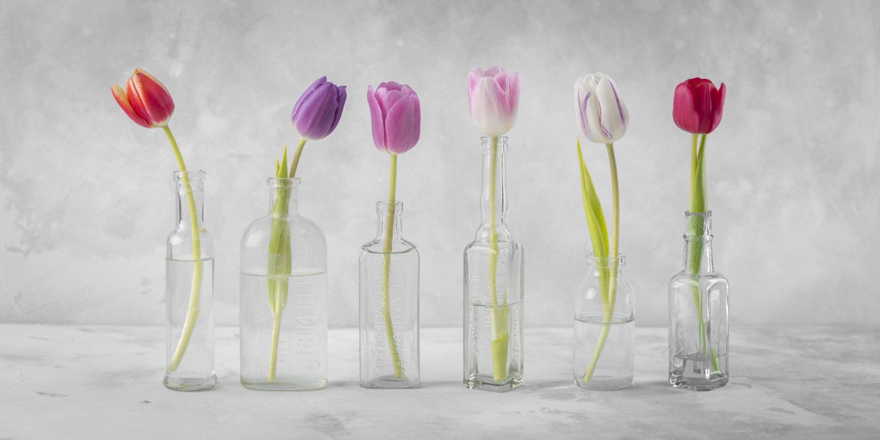 Tulips in glass bottles. Capture the delicate elegance of spring with this wallpaper. It presents tulips in clear glass vessels, adding a touch of nature to your home. Each tulip displays a colorful bloom. This wallpaper for walls provides a clean and soft look to any interior. The neutral background makes the flower colors stand out. Install it in a bedroom for a restful mood or a hallway for an inviting style. The design complements modern and minimalist spaces.
