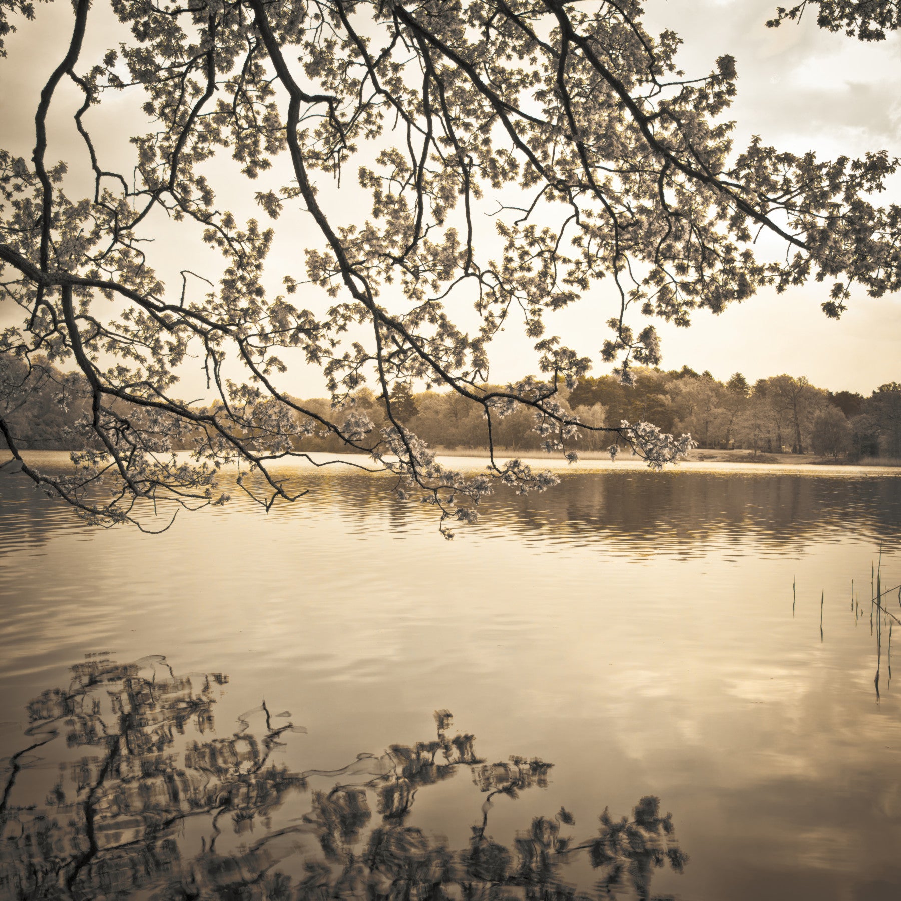 Immerse your living space in the tranquil beauty of 'Branches above Lake'. This stunning wall décor captures a serene scene, where the delicate branches of a blossoming tree gracefully extend over a placid lake. The subtle interplay of light and shadow casts an ethereal glow, creating a calming and reflective atmosphere. The intricate details of the branches, combined with their shimmering reflections on the water's surface, offer a visual feast.