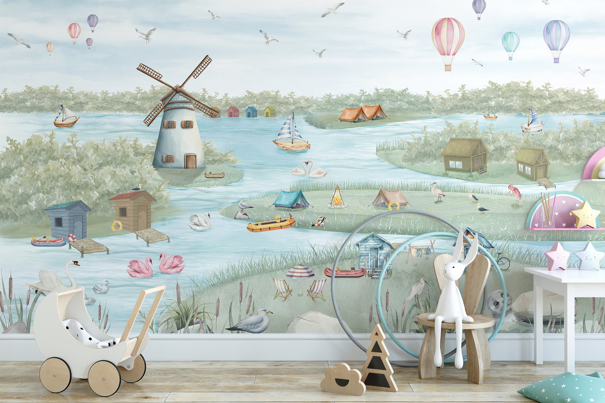 Sail aboard the imagination with the Breezy Shores Wall Mural, where every inch is an exploration for little adventurers. Picture this serene lakes, playful otters, and a skyline dotted with hot air balloons, all from the comfort of the kids room. It’s a wallpaper that speaks in whispers of adventure, igniting young minds to dream up stories of high seas and skies. Each brushstroke on this mural promises a backdrop of creativity for playtimes and sweet dreams. With Breezy Shores, watch as your child's domain turns into a vibrant haven of exploration, without the fuss of a complicated setup. This kids room wallpaper isn't just a backdrop it's a journey to a whimsical world.